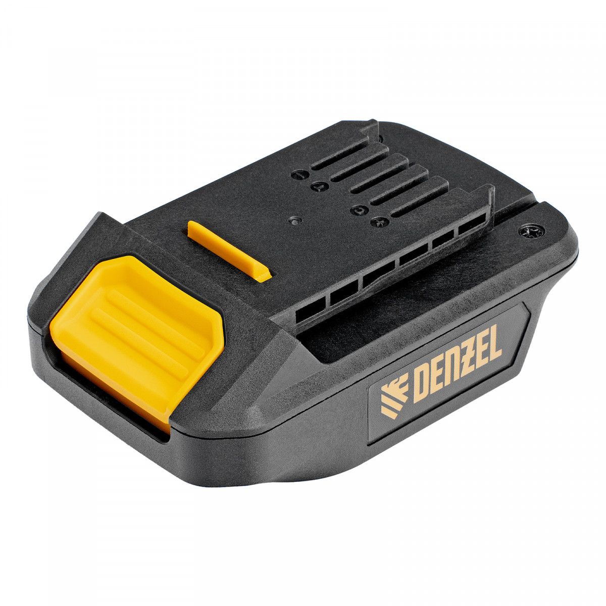 - Простое использование — достаточно присоединить верхнюю часть адаптера к инструменту или зарядному устройству платформы Denzel Power System 18 V, а на нижнюю часть установить аккумулятор Denzel 20 V.