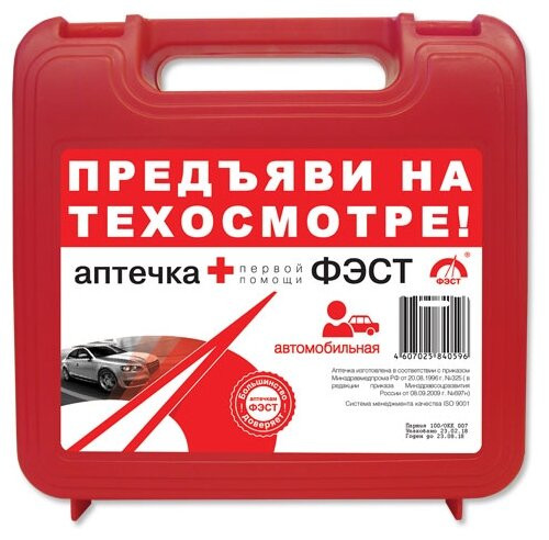 Состав:   жгут кровоостанавливающий 1 шт., бинт марлевый медицинский нестерильный 5 м × 5 см 2 шт., бинт марлевый медицинский нестерильный 5 м × 10 см 2 шт., бинт марлевый медицинский нестерильный 7 м × 14 см 1 шт., бинт марлевый медицинский стерильный 5м × 7 см 2 шт., бинт марлевый медицинский стерильный 5м × 10 см 2 шт., бинт марлевый медицинский стерильный 7м × 14см 1 шт., пакет перевязочный стерильный 1 шт., салфетки марлевые медицинские стерильные, не менее 16 × 14 см №10 1уп., лейкопластырь бактерицидный, не менее 4 см × 10 см 2 шт., лейкопластырь бактерицидный, не менее 1,9 см × 7,2 см 10 шт., лейкопластырь рулонный, не менее 1 см × 250 см 1 шт., устройство для проведения искусственного дыхания «Рот-Устройство-Рот» 1 шт., ножницы 1 шт., перчатки медицинские нестерильные 1 пара, футляр для аптечки 1 шт.