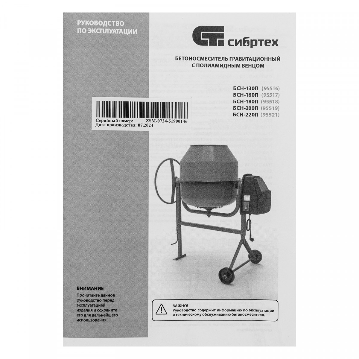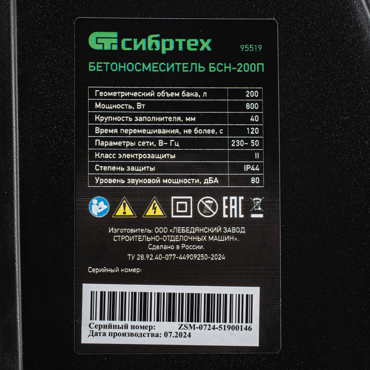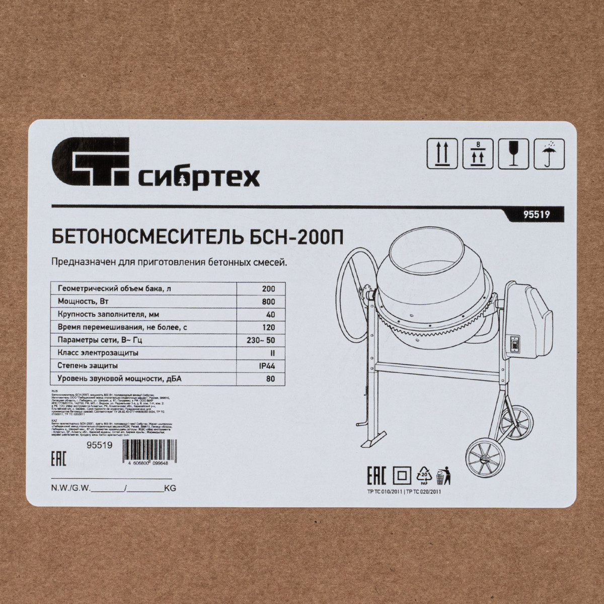 Бетоносмеситель БСН-200П, мощность 800 Вт, полиамидный венец Сибртех