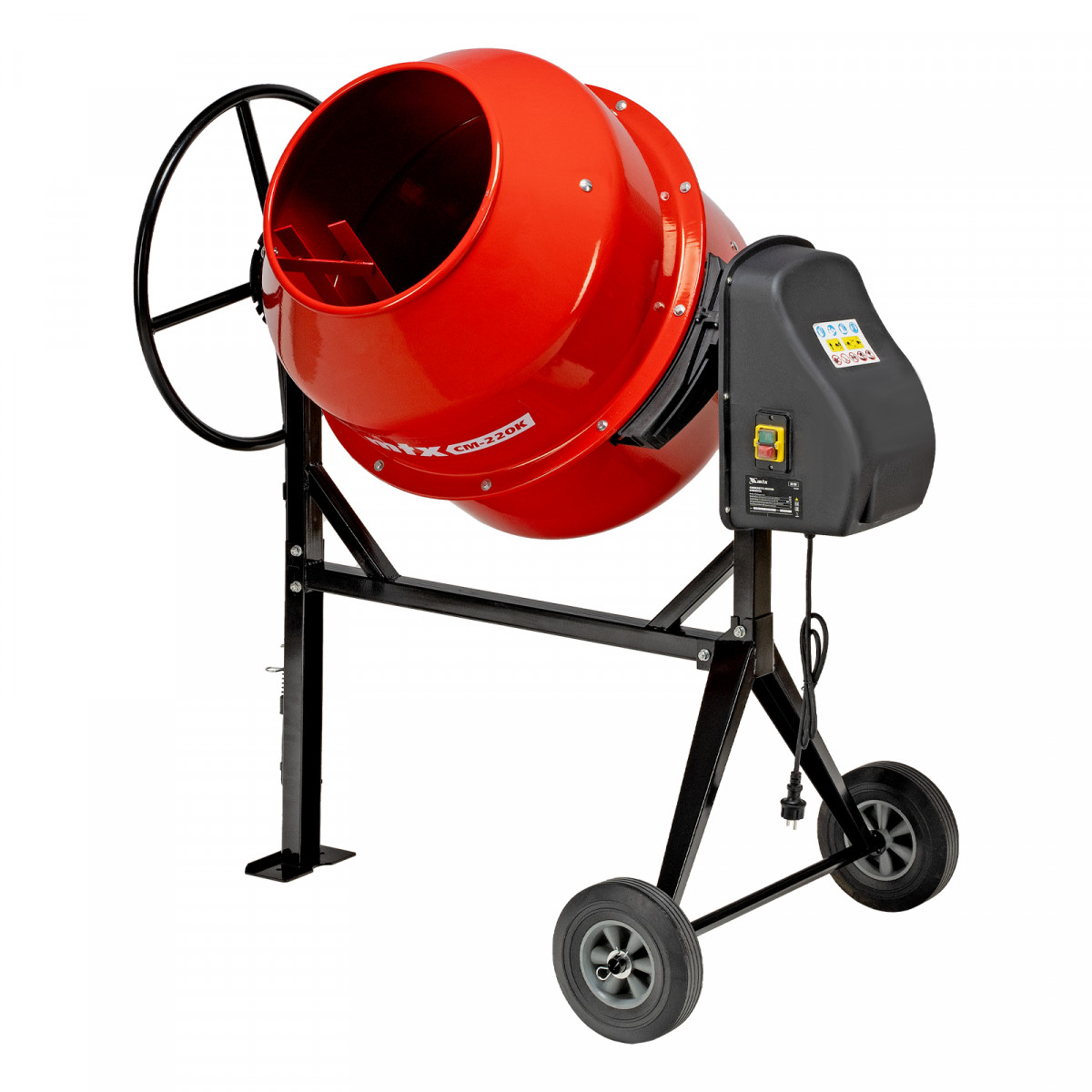 • Мобильность — колеса увеличенного диаметра облегчают перемещение бетоносмесителя по рабочей площадке.