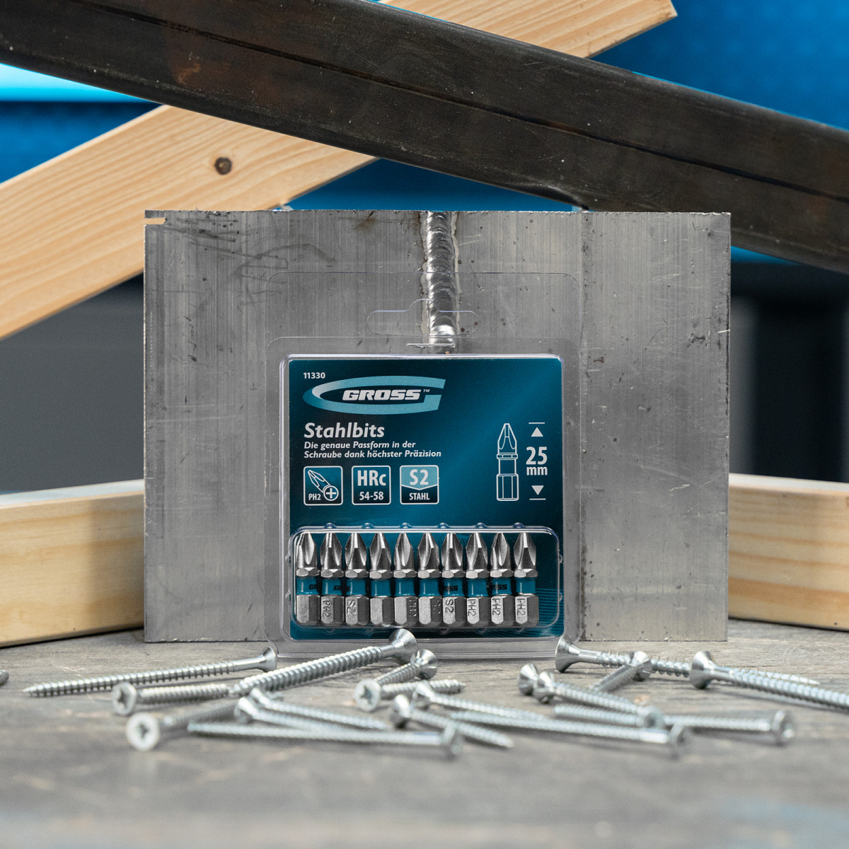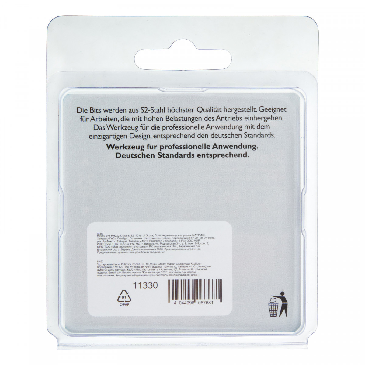 Набор бит Gross 11330 состоит из 10 наиболее востребованных крестообразных насадок типа PH2 длиной 25 мм, с хвостовиком 1/4 дюйма, изготовленных из стали S2 и предназначенных для использования с шуруповертами и отвертками-адаптерами. За счет оптимальной геометрии и высокой точности исполнения шлица биты не проскальзывают в головках крепежа. Оснастки используются для монтажа и демонтажа саморезов по дереву, шурупов и других резьбовых крепежей.