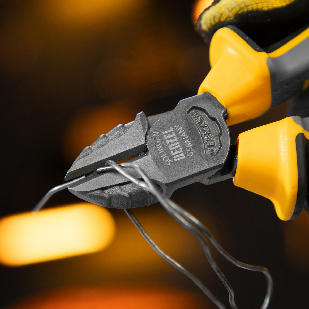 Бокорезы Denzel 17780 длиной 145 мм, с трехкомпонентными рукоятками, предназначены для разрезания кабелей из алюминия и меди, а также проволоки и стяжек. Максимальный диаметр перерезаемой мягкой проволоки (алюминиевой, медной, с пределом прочности 220 Н/мм2) составляет 5 мм, проволоки средней жесткости и гвоздей (750 Н/мм2) — 2,5 мм, жесткой (1800 Н/мм2) — 1,7 мм. Бокорезы используются для проведения слесарных и монтажных работ. Шарнир смещен к режущим кромкам, что позволяет сэкономить 20% усилий и максимально эффективно решать поставленные задачи.