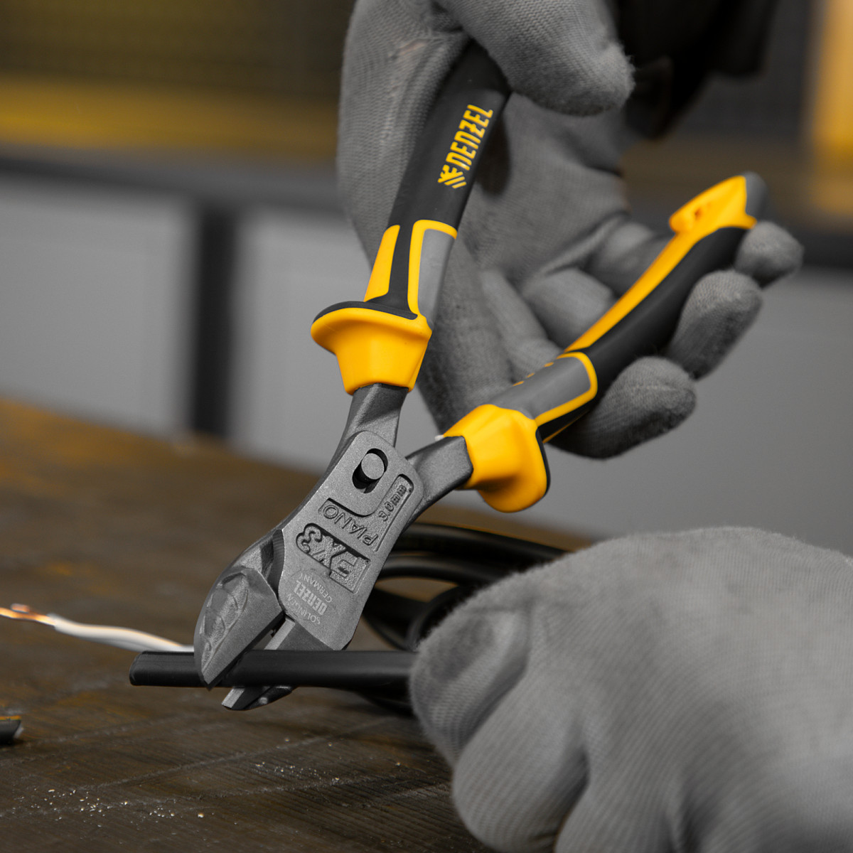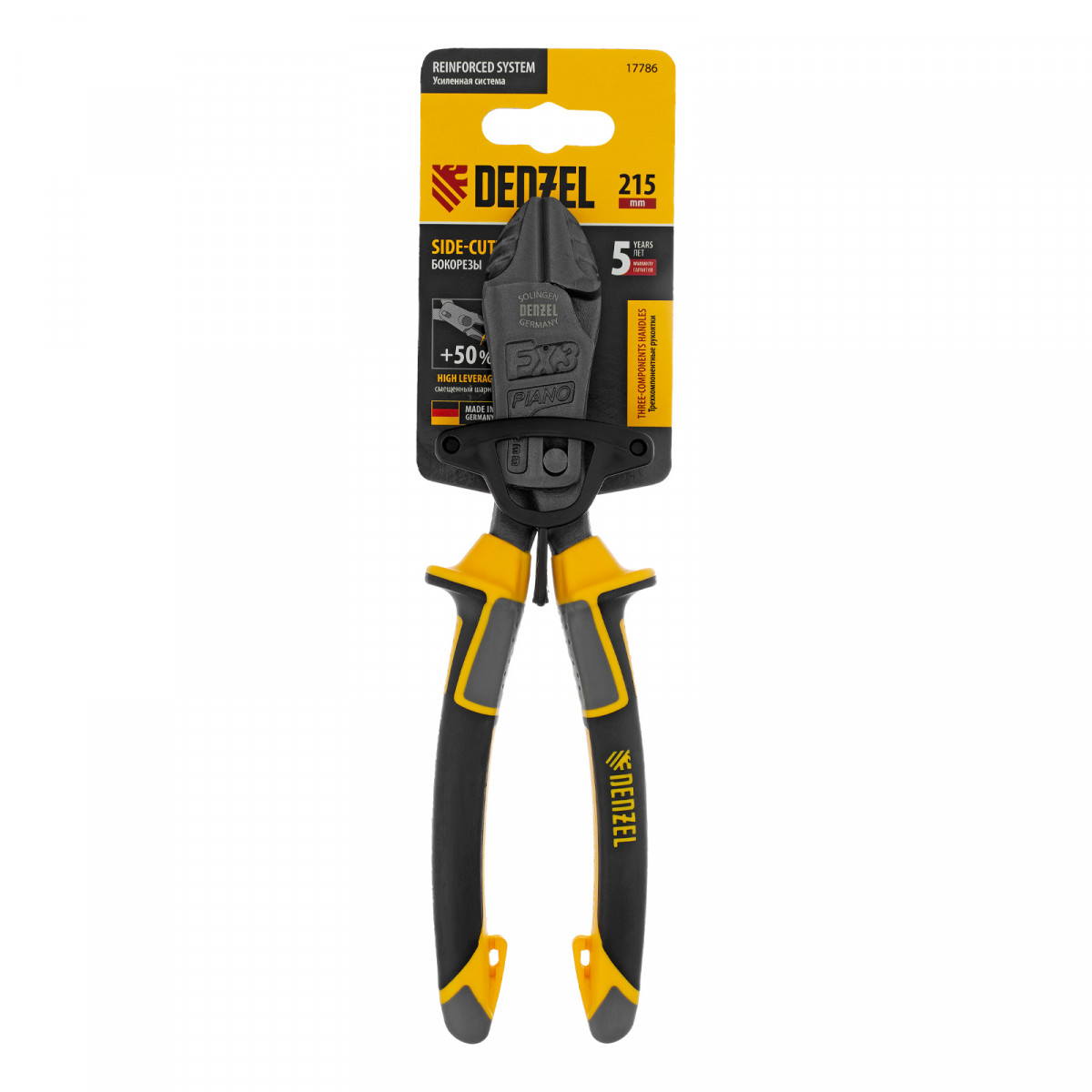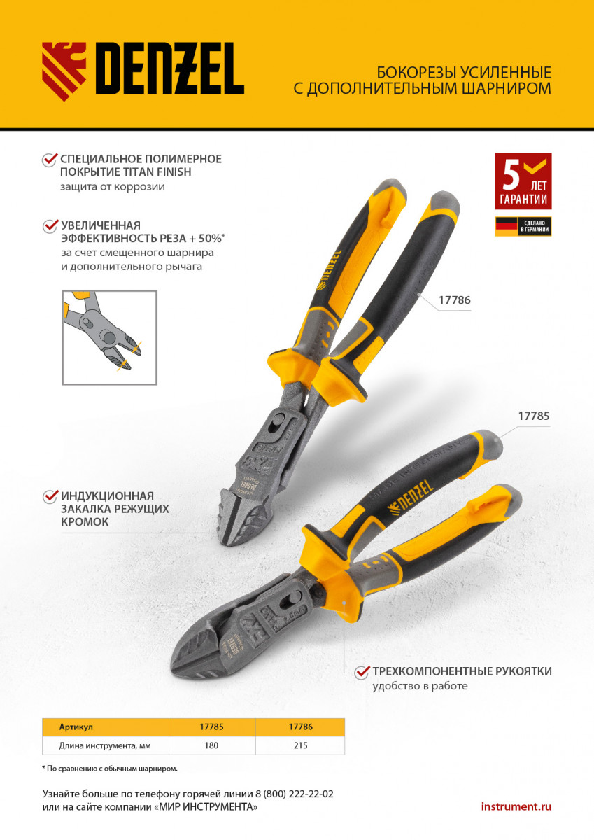 Усиленные бокорезы Denzel 17786 длиной 215 мм, с трехкомпонентными рукоятками, предназначены для разрезания кабелей, проводов, гвоздей и проволоки средней (750 Н/мм2) и высокой жесткости (1800 Н/мм2) диаметром 4,5 и 3,5 мм соответственно. Подходят для резки рояльных струн (предел прочности 2300 Н/мм2) диаметром до 3 мм. Успешно справляются не только с медными, алюминиевыми и пластмассовыми деталями, но и с более жесткими стальными элементами. Встроенный рычажный механизм и смещенный непосредственно к режущим кромкам шарнир увеличивают усилие реза на 50%.