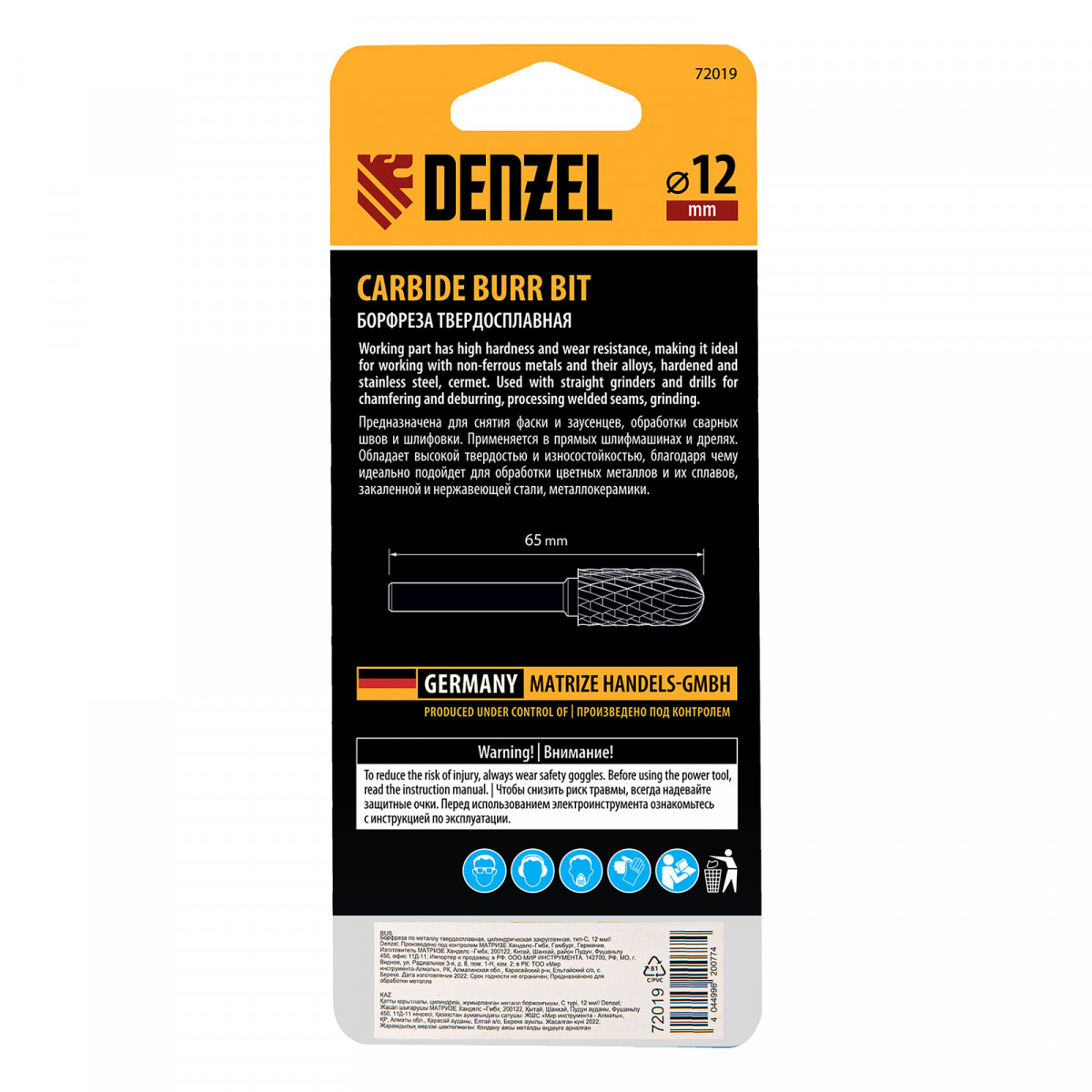 Твердосплавная борфреза Denzel 72019 с цилиндрической закругленной рабочей частью (тип C), диаметром 12 мм, предназначена для шлифовальных работ по металлу: закаленной и нержавеющей стали, латуни, чугуну, бронзе, титану, меди. Также используется для обработки искусственного камня и металлокерамики. Борфреза позволяет зачищать сварные швы, удалять заусенцы и снимать фаски. Форма рабочей части оптимальна для обработки радиусных пазов, поверхностей с плавными изгибами. Также с помощью борфрезы можно быстро и эффективно восстановить гравировку. Оснастка устанавливается на дрель или прямошлифовальную машину.