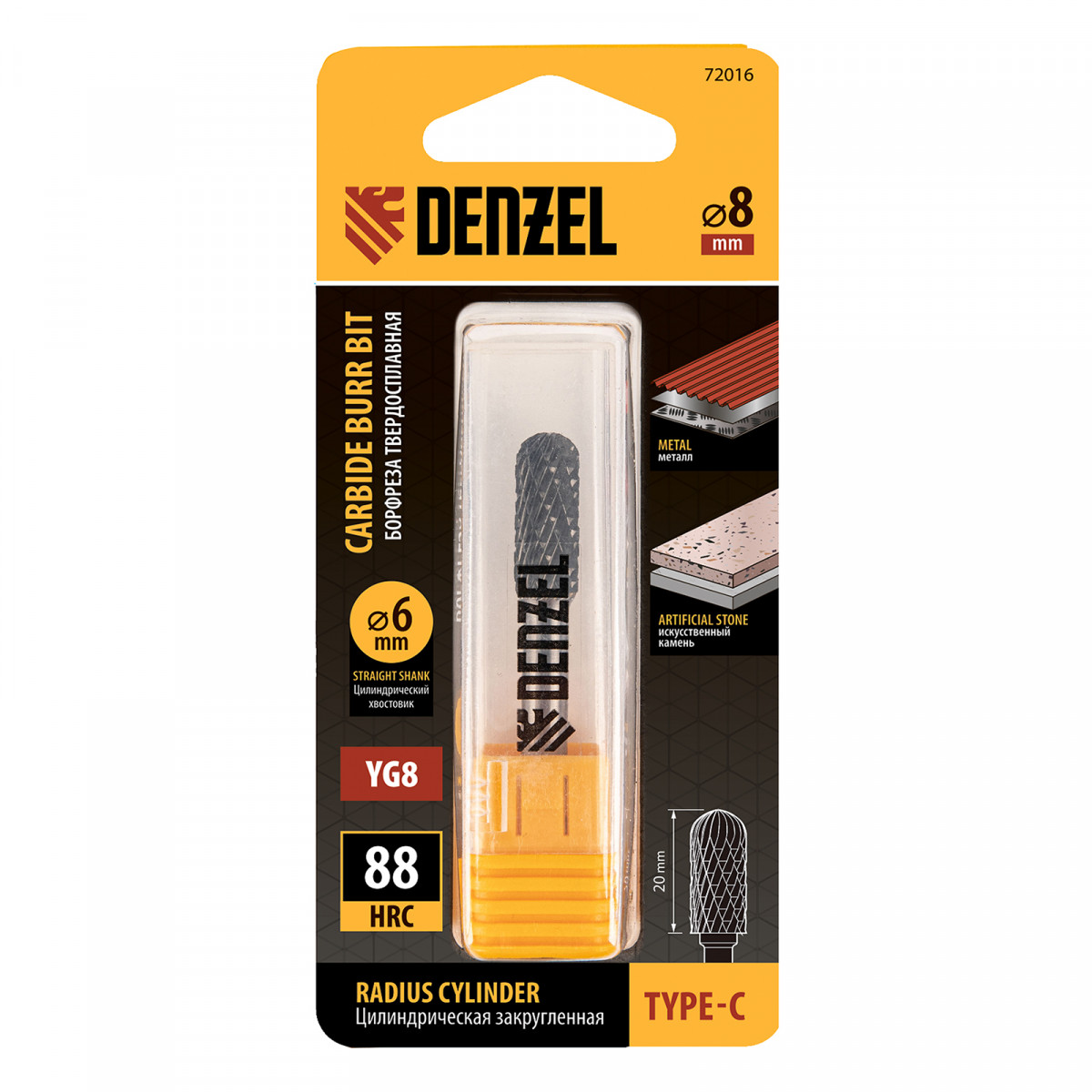 Борфреза по металлу твердосплавная, цилиндрическая закругленная, тип-С, 8 мм Denzel