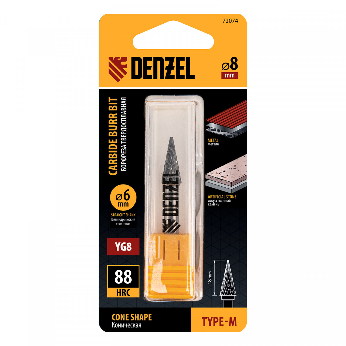 Борфреза по металлу твердосплавная, коническая, тип-M, 8 мм Denzel