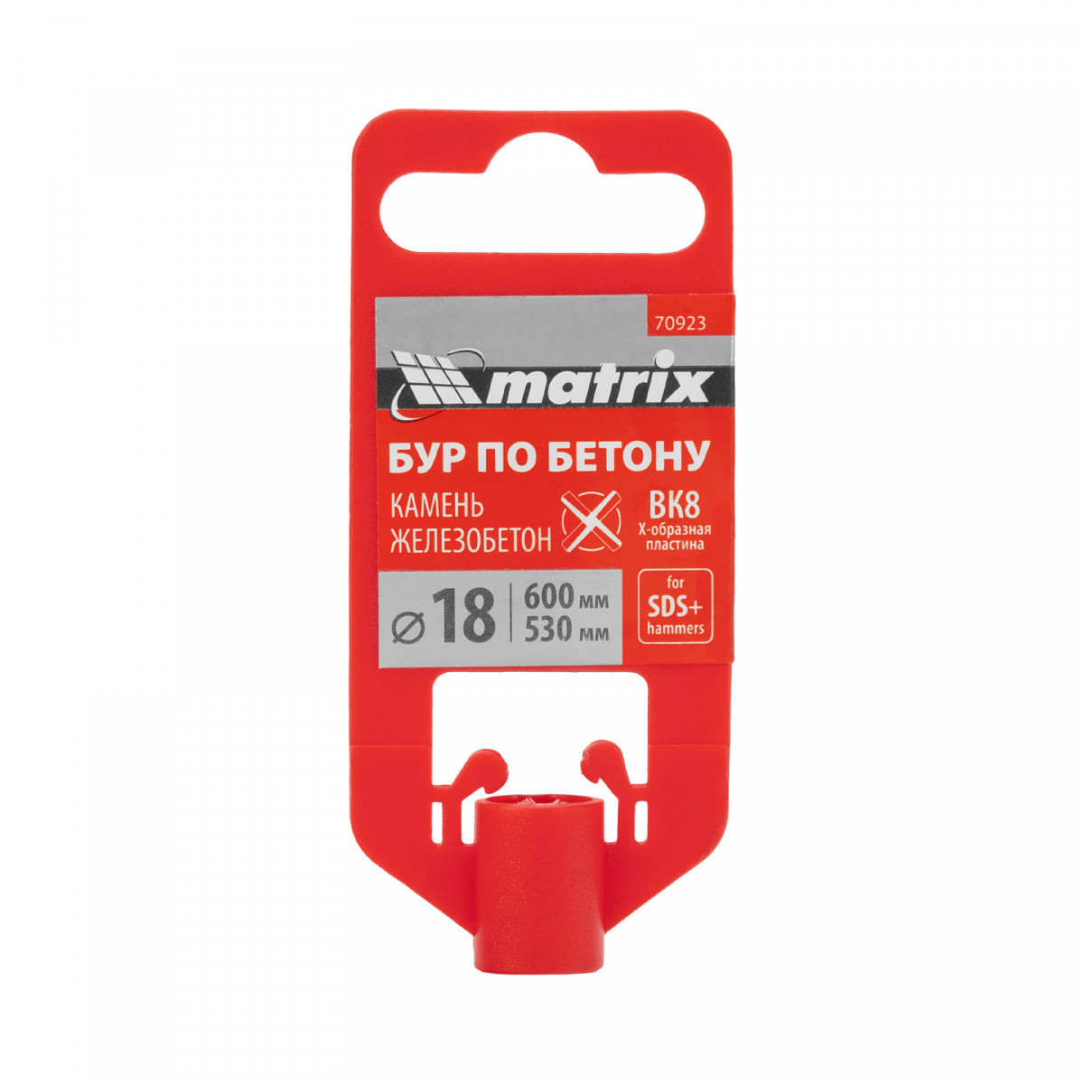 Бур по бетону Matrix 70923 длиной 600 мм, с хвостовиком SDS-plus и крестовой пластиной, предназначен для получения отверстий диаметром 18 мм в бетоне, камне и кирпиче. Крестовая пластина обеспечивает эффективную работу с твердыми материалами, в том числе армированным бетоном. Бур устанавливается в патрон перфоратора и используется во время проведения строительных работ.