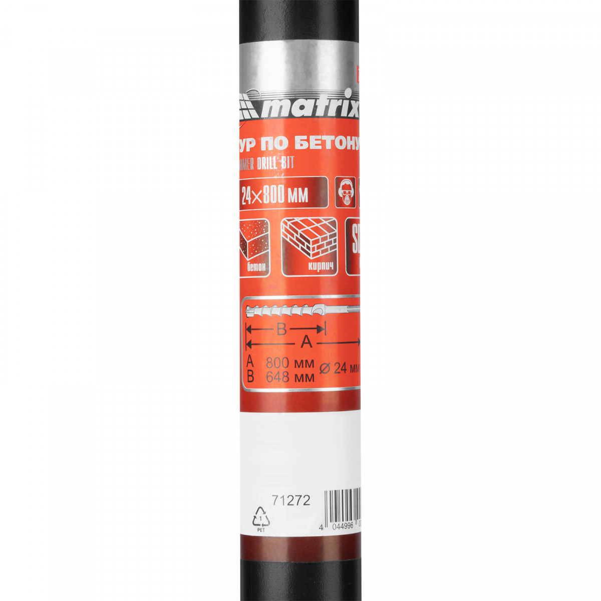 Бур по бетону Matrix 71272 размером 24 х 800 мм используется в качестве оснастки на тяжелых перфораторах с хвостовиком SDS MAX. Подходит для сверления глубоких отверстий в кирпиче и особо прочных материалах: армированном бетоне, природном и искусственном камне.