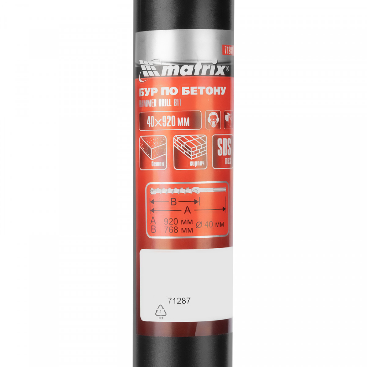 Бур по бетону Matrix 71287 размером 40 х 920 мм используется в качестве оснастки на тяжелых перфораторах с хвостовиком SDS MAX. Подходит для сверления глубоких отверстий в кирпиче и особо прочных материалах: армированном бетоне, природном и искусственном камне.