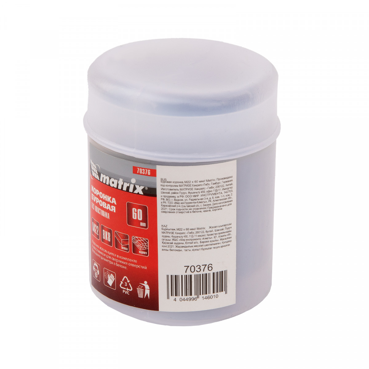 Буровая коронка M22 х 60 мм Matrix 70376 рассчитана на сверление отверстий в бетоне, кирпиче, граните, природном и искусственном камне. Устанавливается на ударные дрели или перфораторы с патронами под хвостовик SDS-Plus или SDS-Max. Коронка позволяет получить большие отверстия, поэтому пригодится для монтажа розеток, выключателей и прокладки труб.
