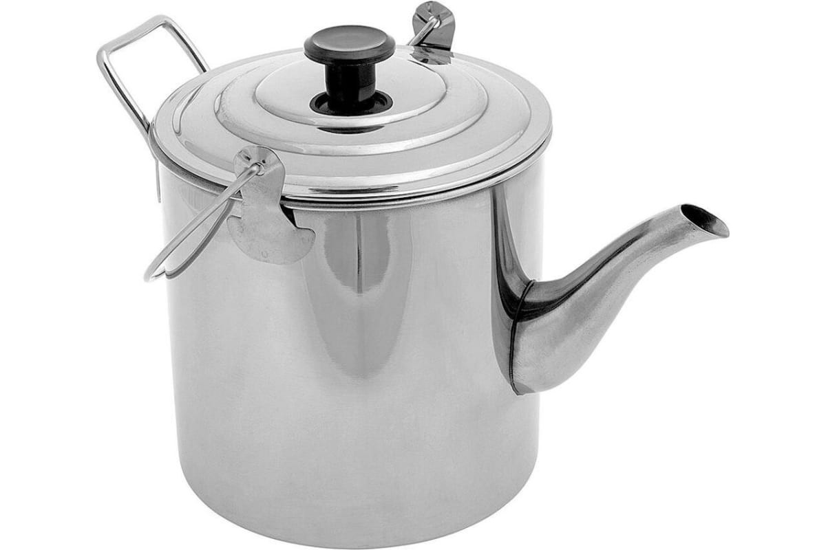 Чайник туристический из нержавеющей стали объемом 1,8 л. Вскипяченной за раз воды хватит на 5-6 человек.Имеет удобные складные ручки и правильную форму носика для разливания по чашкам.Пищевая нержавейка, из которой он сделан, обеспечивает достаточную прочность изделия и быстрое закипание воды.Рекомендован для использования на плитках и горелках, а также на костре.