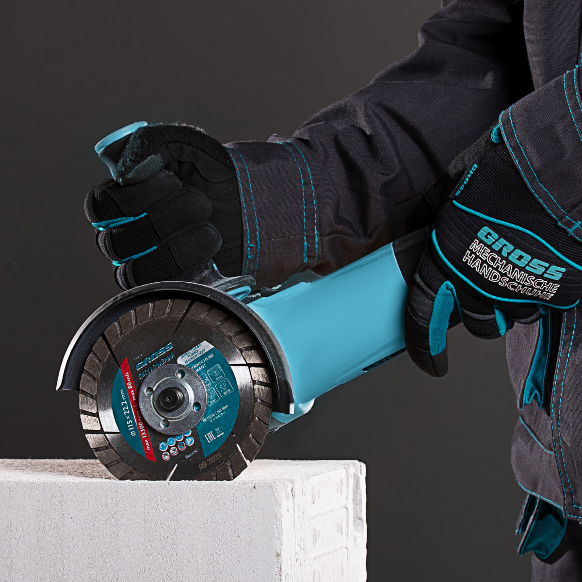 Алмазный турбо-сегментный диск Gross 73019 диаметром 115 х 22,2 мм, для сухой резки, — оснастка для УШМ со скоростью вращения до 13300 об/мин, предназначенная для отрезных работ. Универсальный диск с турбированной рабочей частью можно использовать для резки камня, гранита и кирпича, свежего бетона, а также слабоармированного железобетона. Он подходит для профессионального использования.