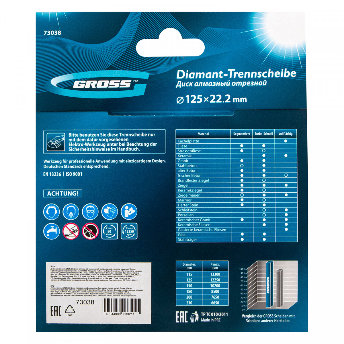 Диск алмазный, 125 х 22.2 мм, сплошной c лазерной перфорацией, мокрая резка Gross