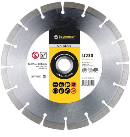 Сегментный алмазный отрезной диск Baumesser Universal разработан для резки тротуарной плитки, кирпича, песчаника, пенобетона и твердого неармированного бетона. Его преимуществами являются высокий ресурс работы и выгодная цена.