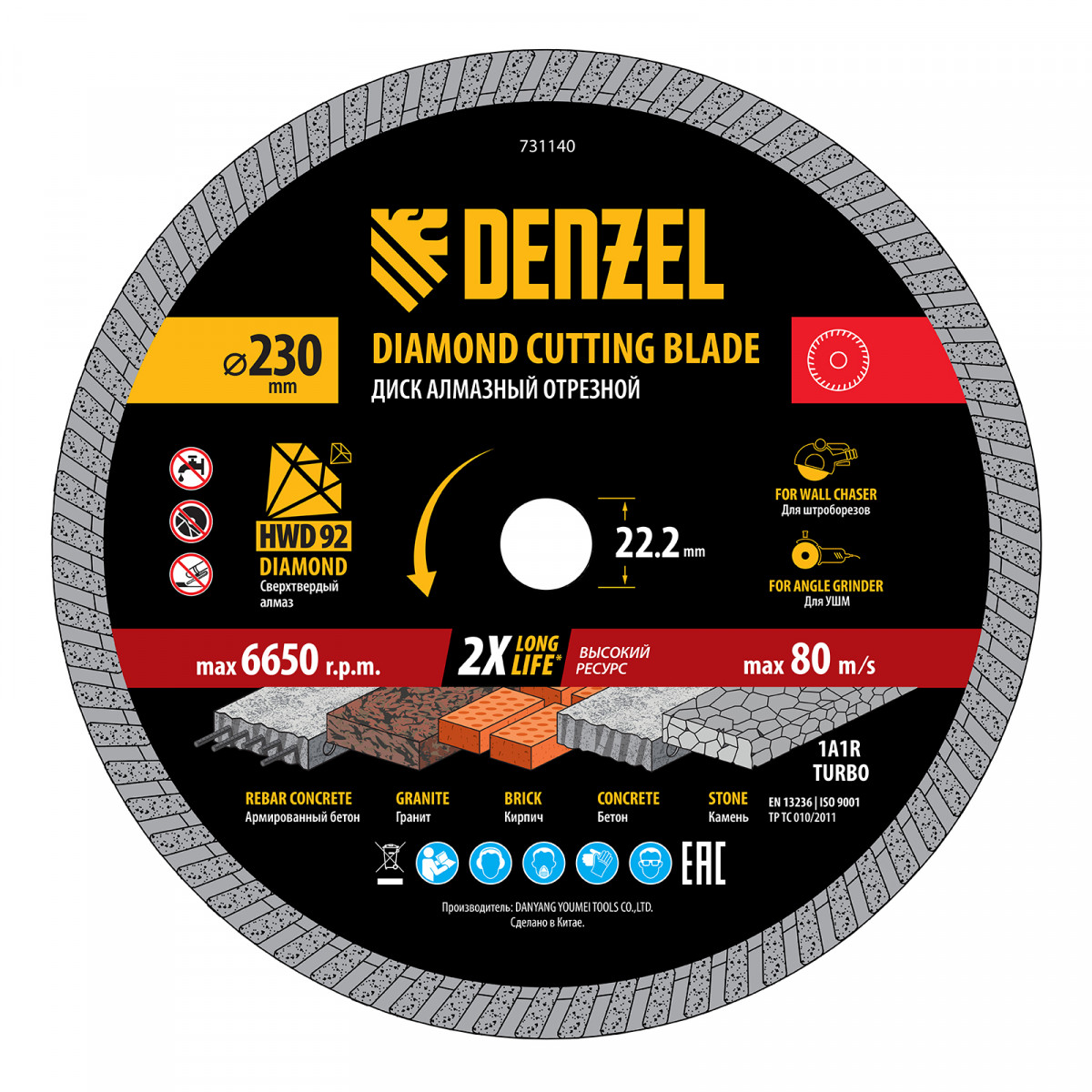 Алмазный отрезной диск Турбо Denzel HWD92 731140 диаметром 230 мм, с посадочным размером 22,2 мм и слоем сверхтвердых алмазов HWD92, устанавливается на углошлифовальную машину (УШМ) или штроборез. Используется для сухого резания камня, бетона (в том числе армированного), гранита, кирпича. Рекомендуемая частота вращения — 6650 об/мин.