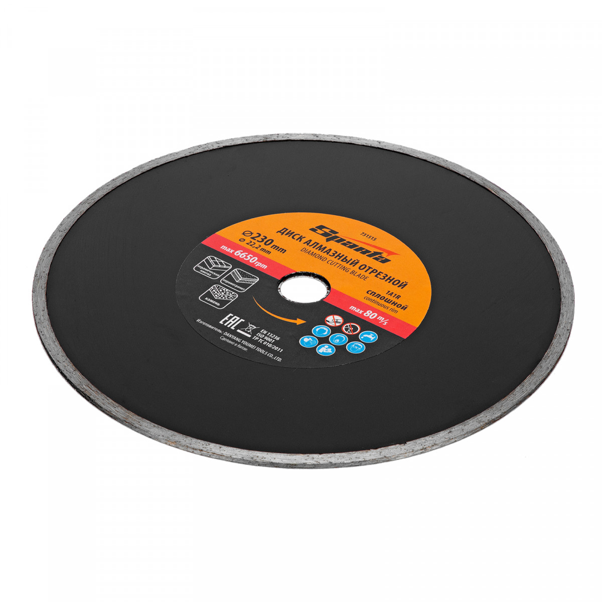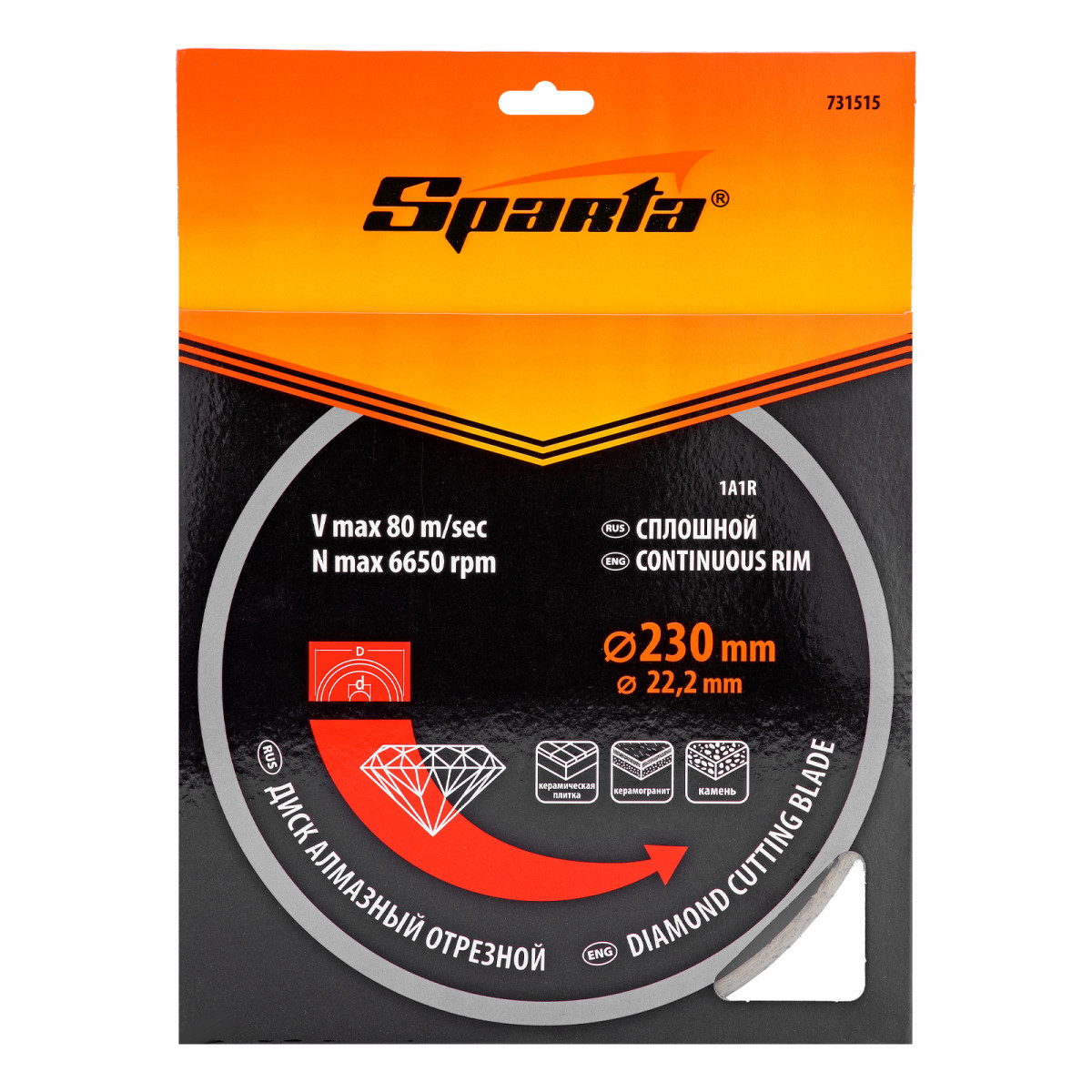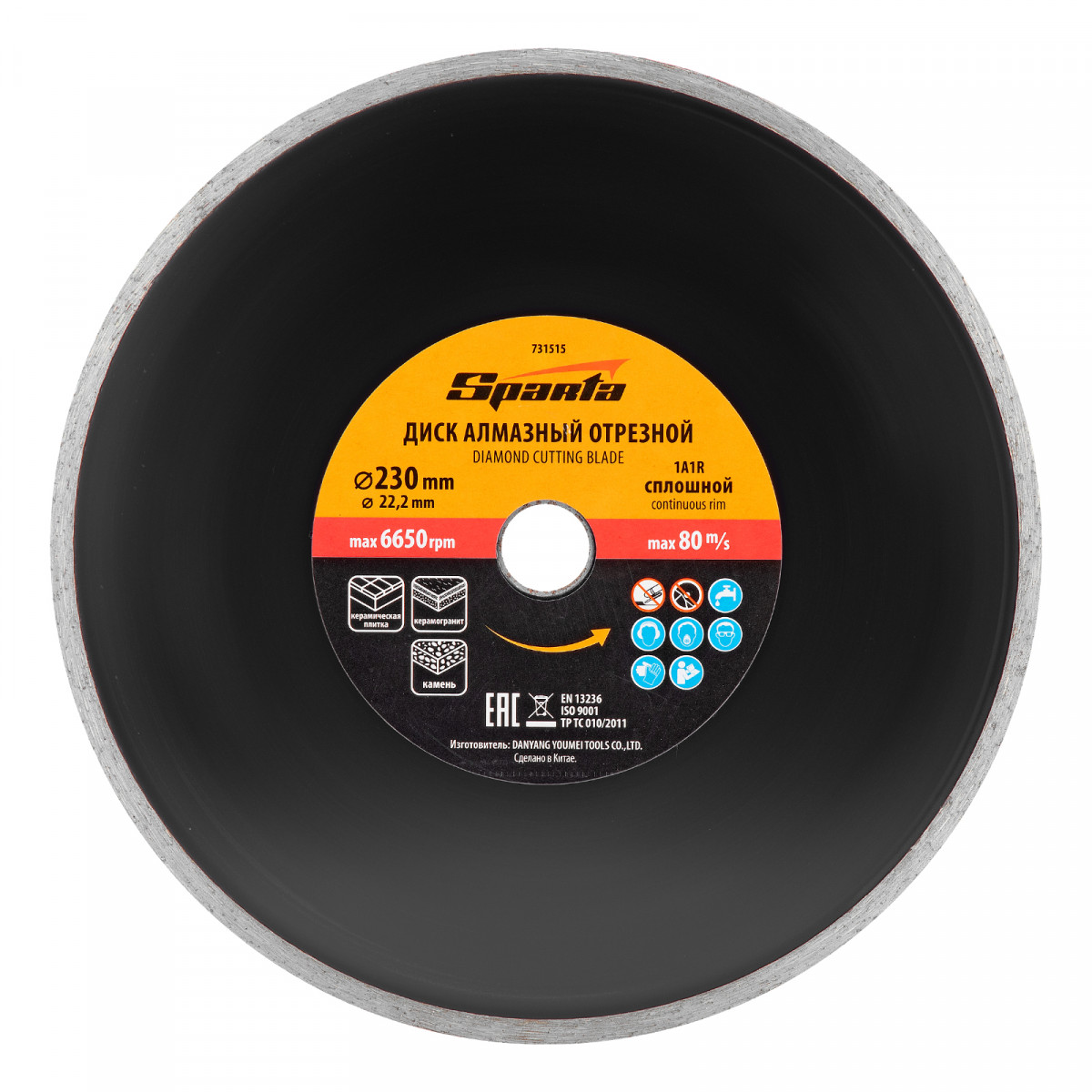 Отрезной алмазный диск Sparta 731515, сплошной, 230 х 22,2 мм, — расходный инструмент для болгарок и плиткорезов, используемый для мокрого резания. Он позволяет выполнить аккуратный рез по керамике, керамограниту и мрамору в бытовых условиях. Рекомендуется применять с использованием водяного охлаждения.
