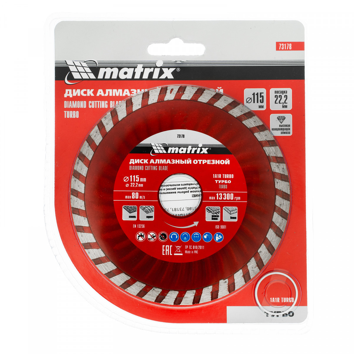 Отрезной алмазный диск Matrix Turbo 73178 диаметром 115 х 22,2 мм, предназначен для сухой резки. Используется в качестве сменной оснасткой для углошлифовальных машин (УШМ) во время ремонта и мелкого строительства, а также в быту. Позволяет работать по бетону, в том числе свежему и среднеармированному, камню и кирпичу.