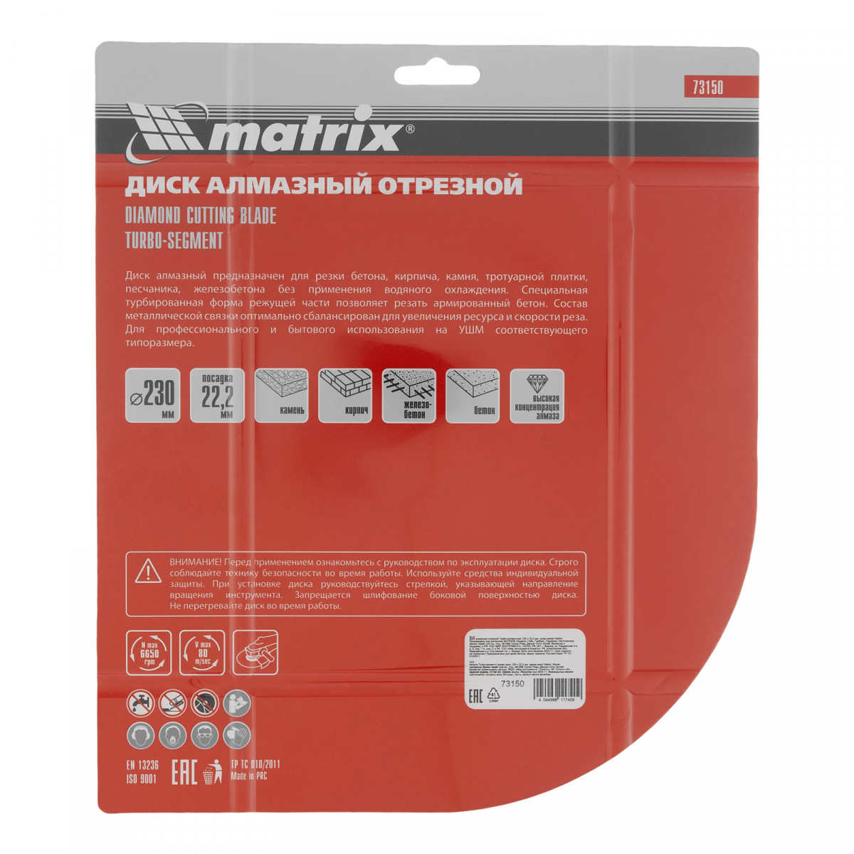Турбо-сегментный отрезной алмазный диск Matrix 73150 диаметром 230 х 22,2 мм предназначен для сухой резки бетона различной прочности, камня, кирпича, тротуарной плитки, шлакоблока. Устанавливается на углошлифовальную машину с посадочным размером 22,2 мм. Благодаря специально подобранной металлической связке диск демонстрирует высокие результаты работы даже при резке слабоармированного железобетона. Оснастка оптимальна для бытового применения.