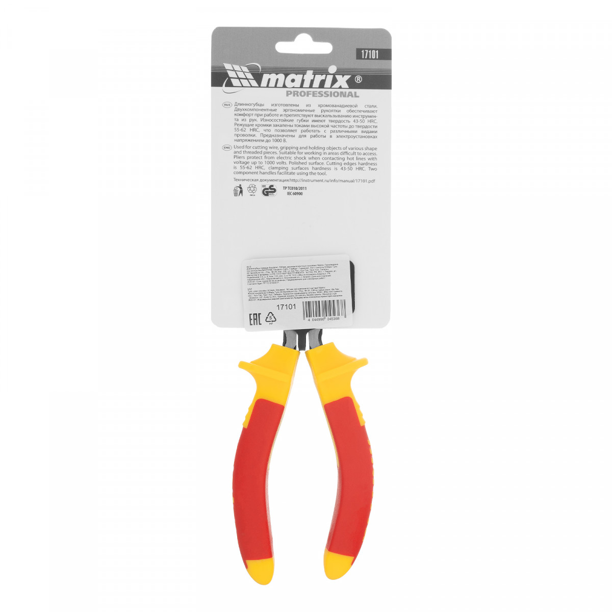 Прямые длинногубцы Matrix Insulated 17101 длиной 160 мм, с двухкомпонентными рукоятками, служат для удерживания гвоздей и других мелких деталей, перекусывания проволоки, ремонта мелкой техники и решения других задач. Инструмент удобен для работы в труднодоступных местах и будет полезен домашнему мастеру. Рукоятки обладают диэлектрическими свойствами до 1000 В, однако техника безопасности запрещает проводить работы под напряжением!