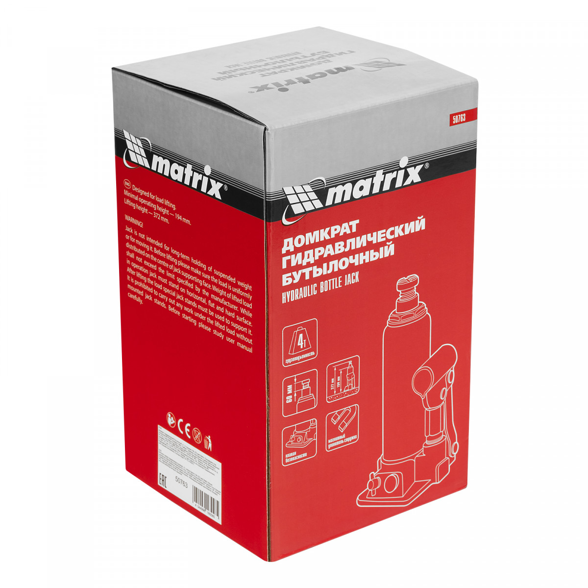 Домкрат гидравлический бутылочный, 4 т, h подъема 194-372 мм Matrix