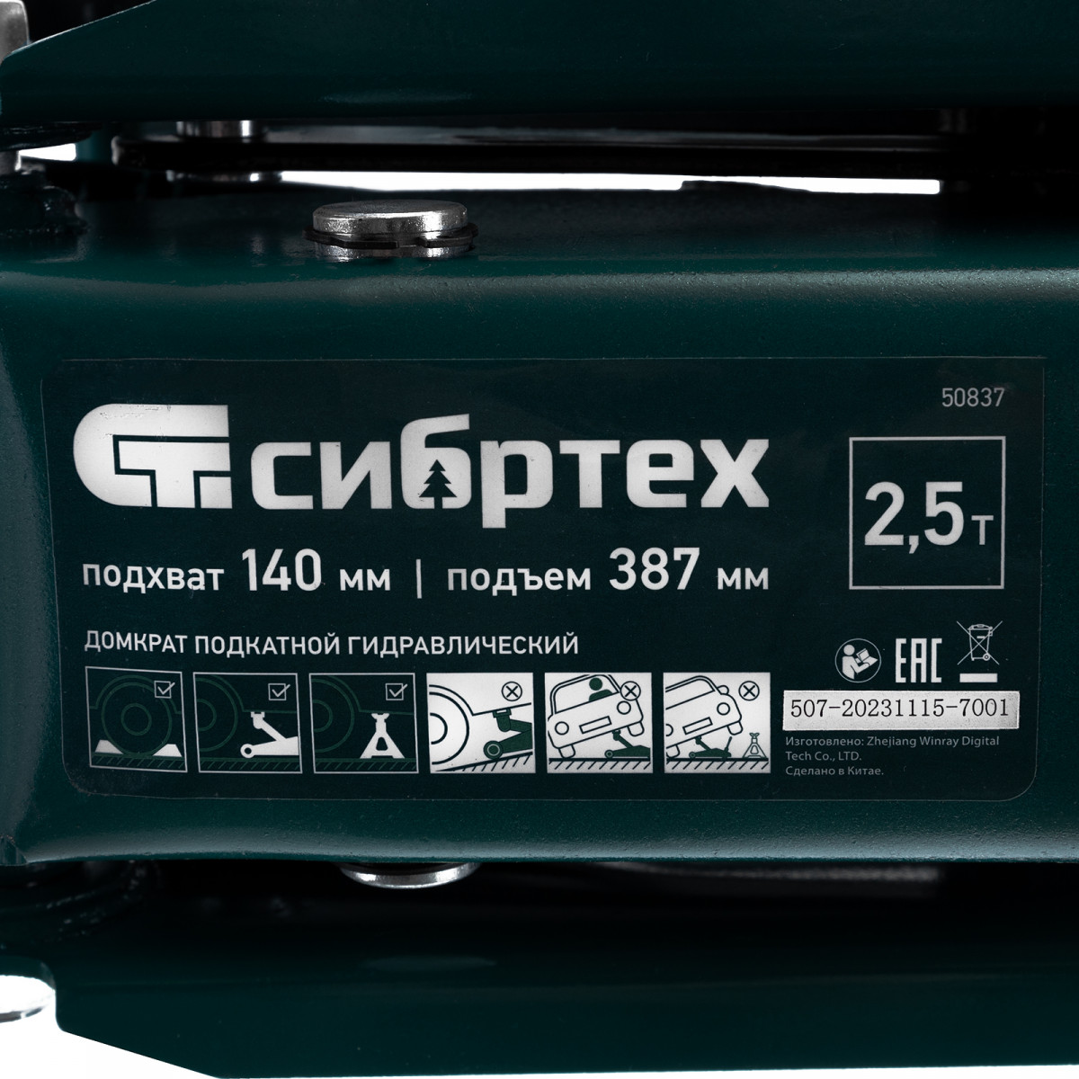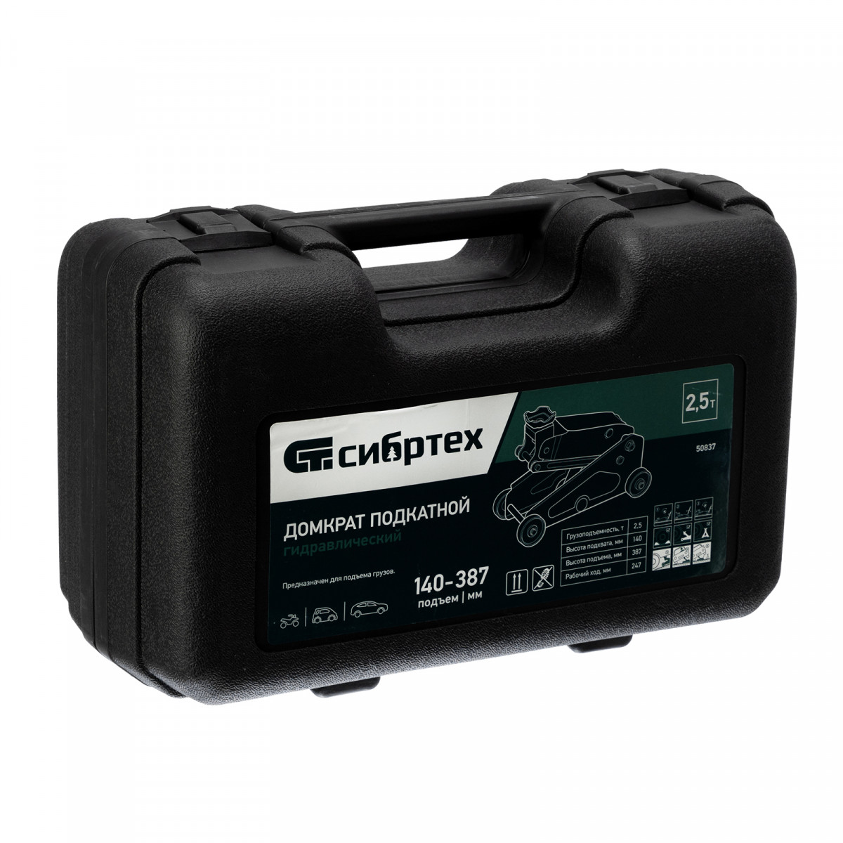 Гидравлический подкатной домкрат Сибртех 50837, поставляющийся в пластиковом кейсе, с высотой подхвата 140 мм, предназначен для подъема грузов массой до 2,5 т на высоту до 387 мм. Применяется для обслуживания автомобилей со стандартным клиренсом. Компактный домкрат подходит для самостоятельного использования автовладельцами.