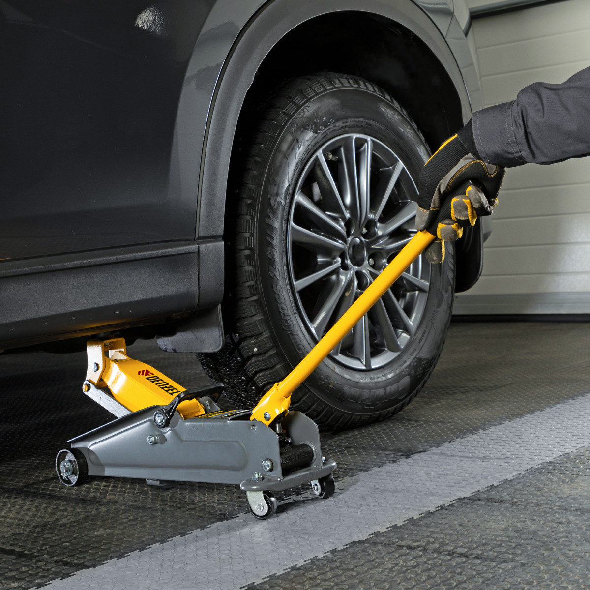 - Удобное хранение и транспортировка — домкрат поставляется в прочном пластиковом кейсе.