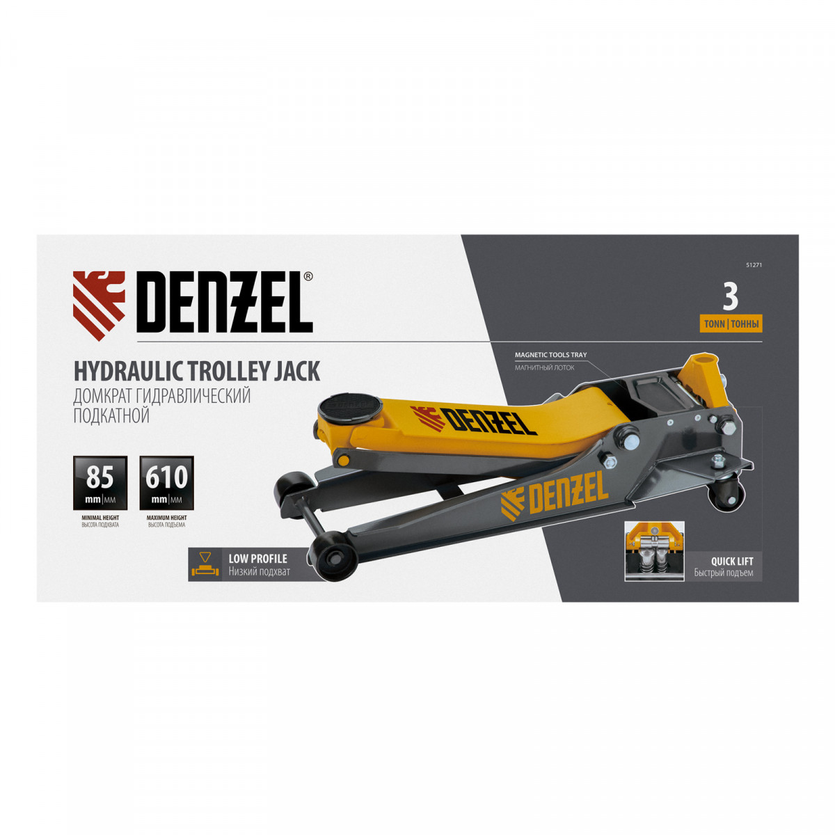Домкрат гидравлический подкатной, 3 т, 85-610 мм, быстрый подъем, низ. подхват, проф, SUV Denzel