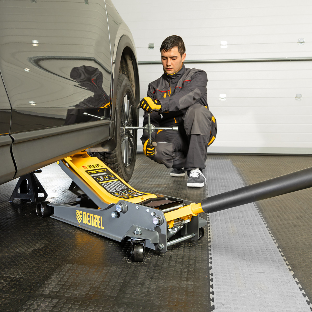 Профессиональный подкатной гидравлический домкрат Denzel 51271 с низким подхватом используется для быстрого подъема на высоту 85-610 мм всех типов автомобилей с любым клиренсом и массой до 3 т, в том числе SUV. В гидравлическом блоке предусмотрено 2 насоса (система быстрого подъема QUICK LIFT), благодаря чему для достижения предельной высоты достаточно 6 качков рукоятки. Домкрат подходит для использования на станциях техобслуживания и шиномонтажа.