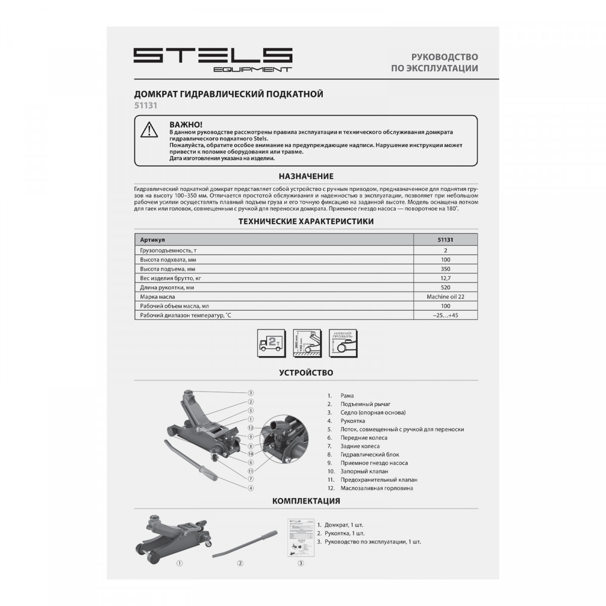 Домкрат гидравлический подкатной, поворотная рукоятка, 2 т, Low Profile, 100-350 мм Stels