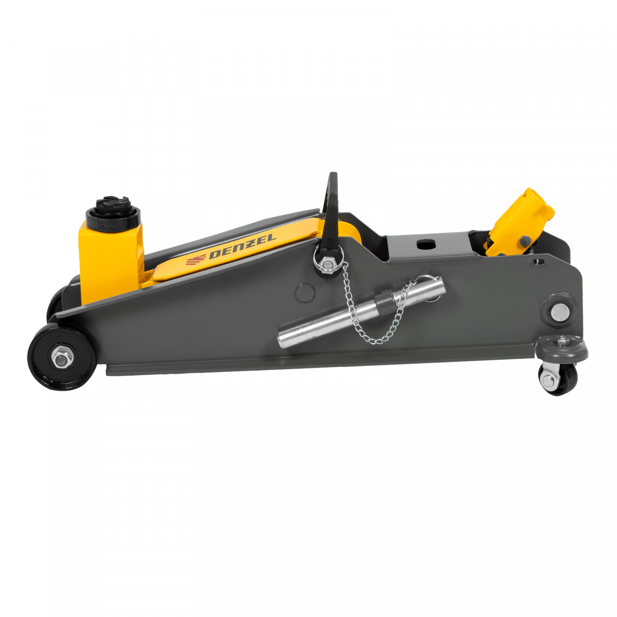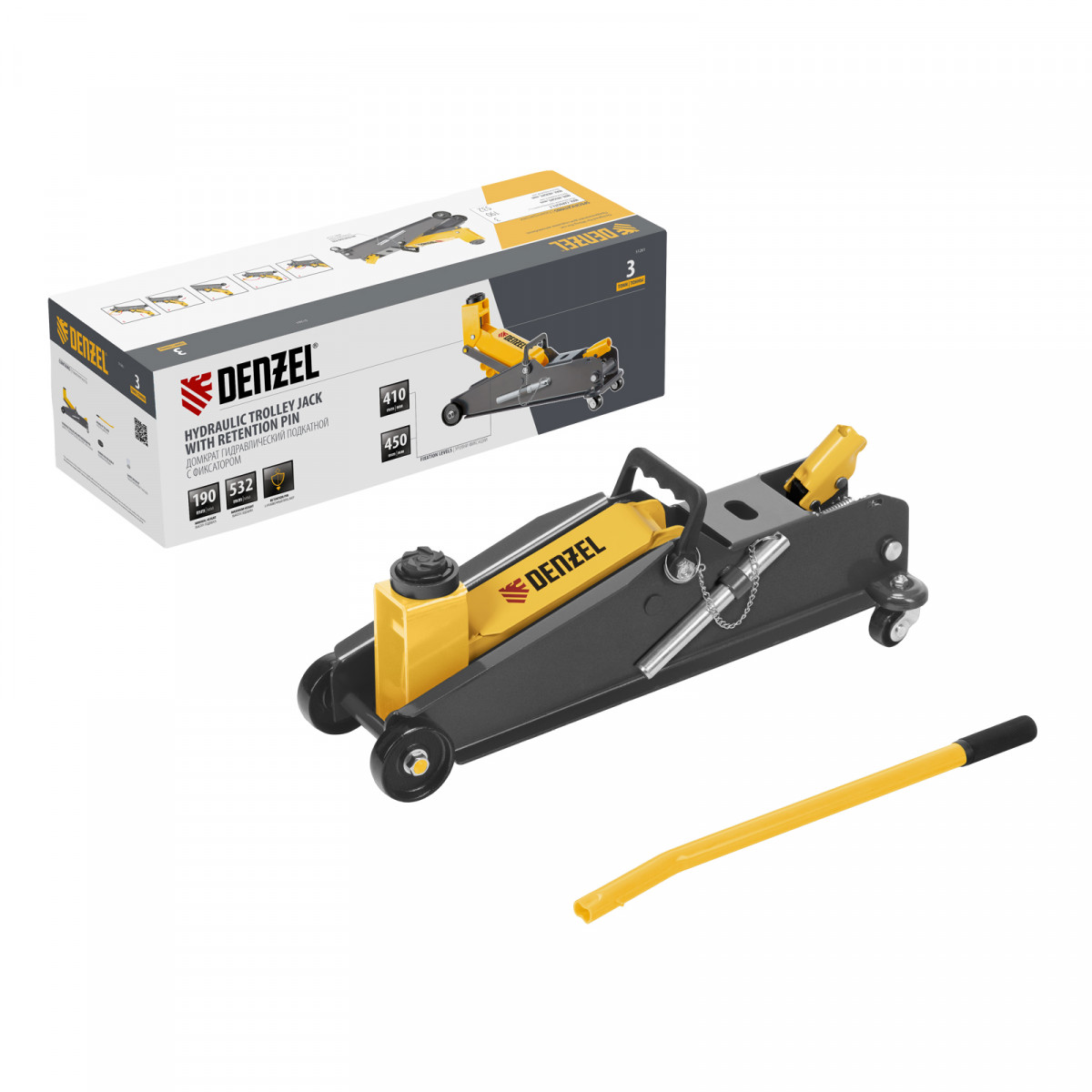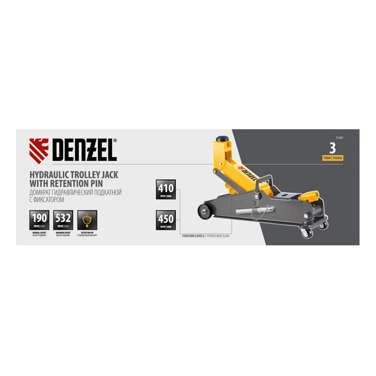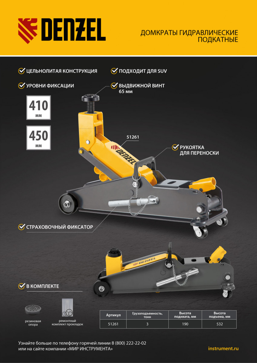 Гидравлический подкатной домкрат Denzel 51261 с фиксатором имеет высоту подхвата 190 мм и предназначен для плавного подъема грузов массой до 3 т (в том числе автомобилей класса SUV) на высоту до 532 мм. Страховочный штифт позволяет фиксировать подъемный рычаг на высоте 410 и 450 мм для безопасной работы. Домкрат пригодится владельцам легковых автомобилей со стандартным клиренсом.