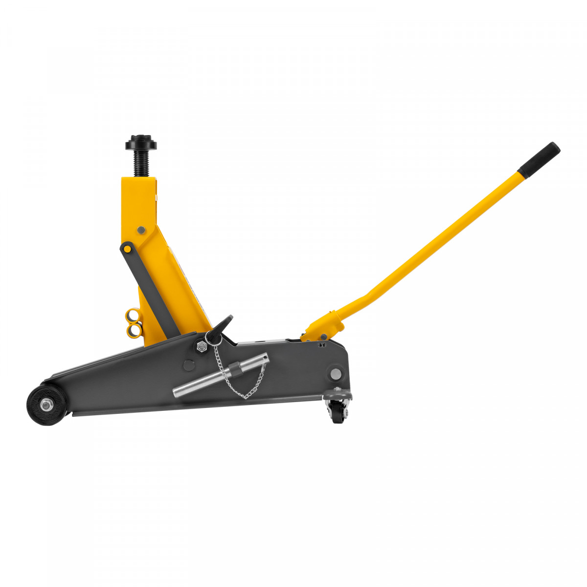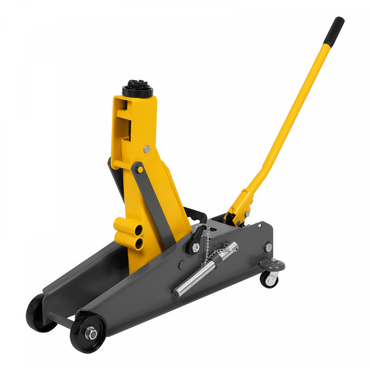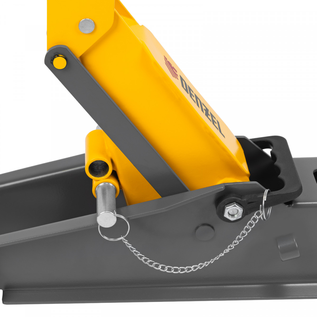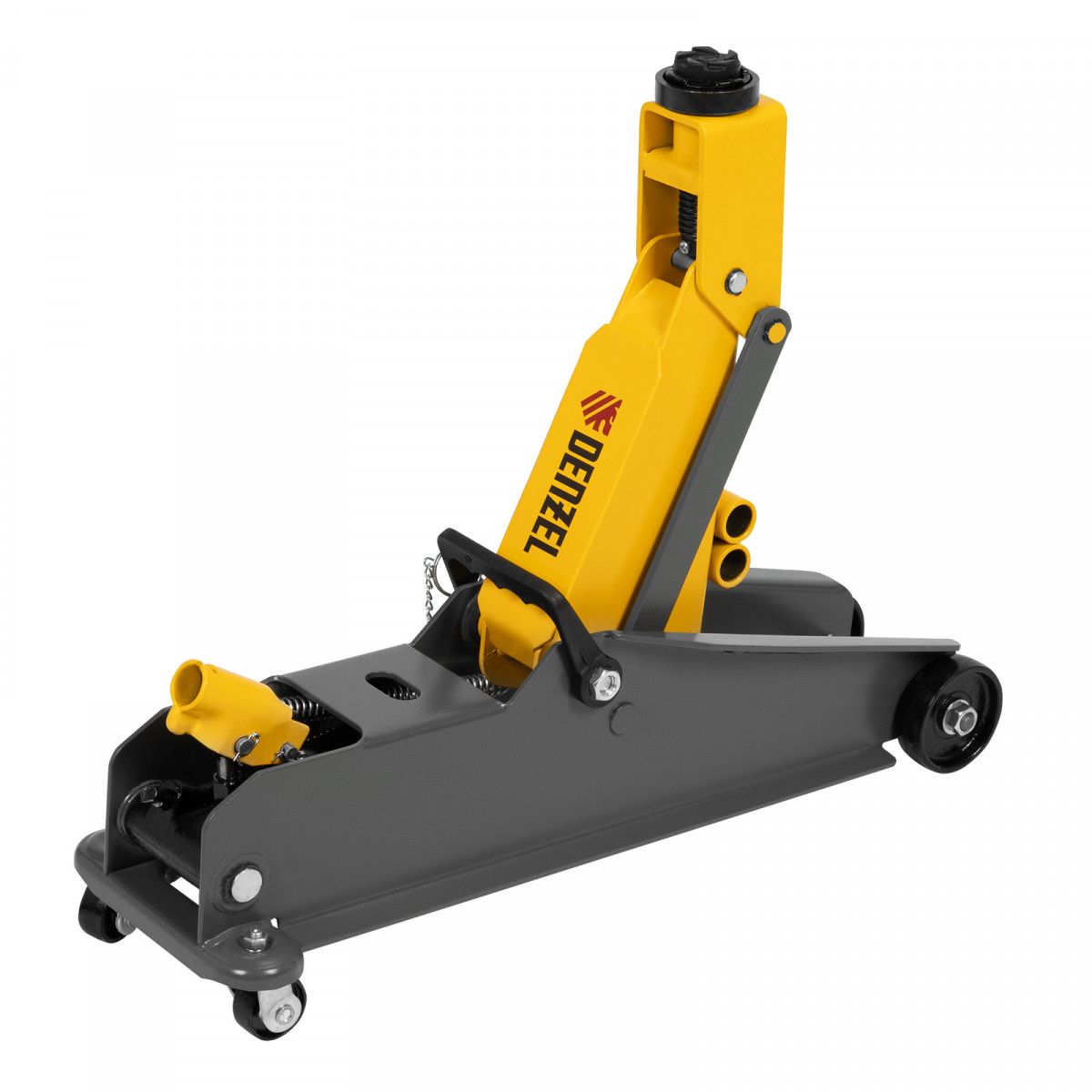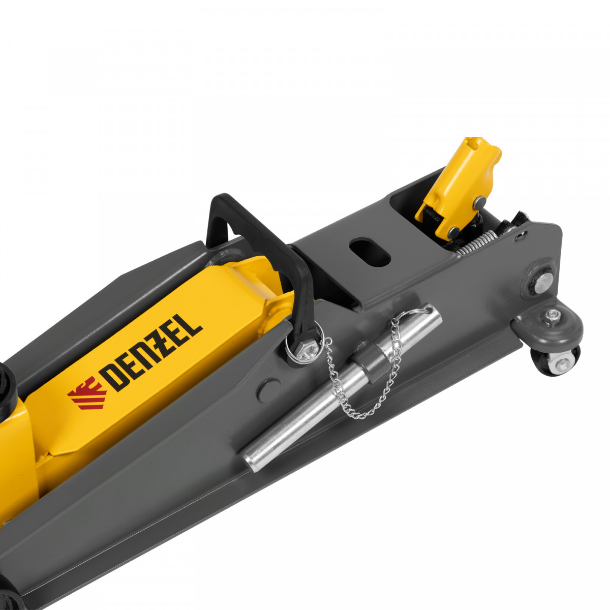 Гидравлический подкатной домкрат Denzel 51261 с фиксатором имеет высоту подхвата 190 мм и предназначен для плавного подъема грузов массой до 3 т (в том числе автомобилей класса SUV) на высоту до 532 мм. Страховочный штифт позволяет фиксировать подъемный рычаг на высоте 410 и 450 мм для безопасной работы. Домкрат пригодится владельцам легковых автомобилей со стандартным клиренсом.