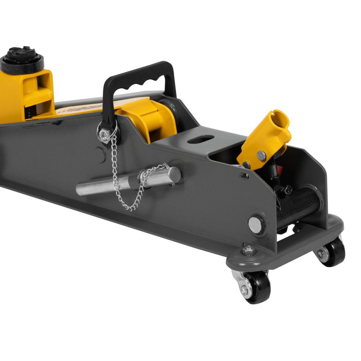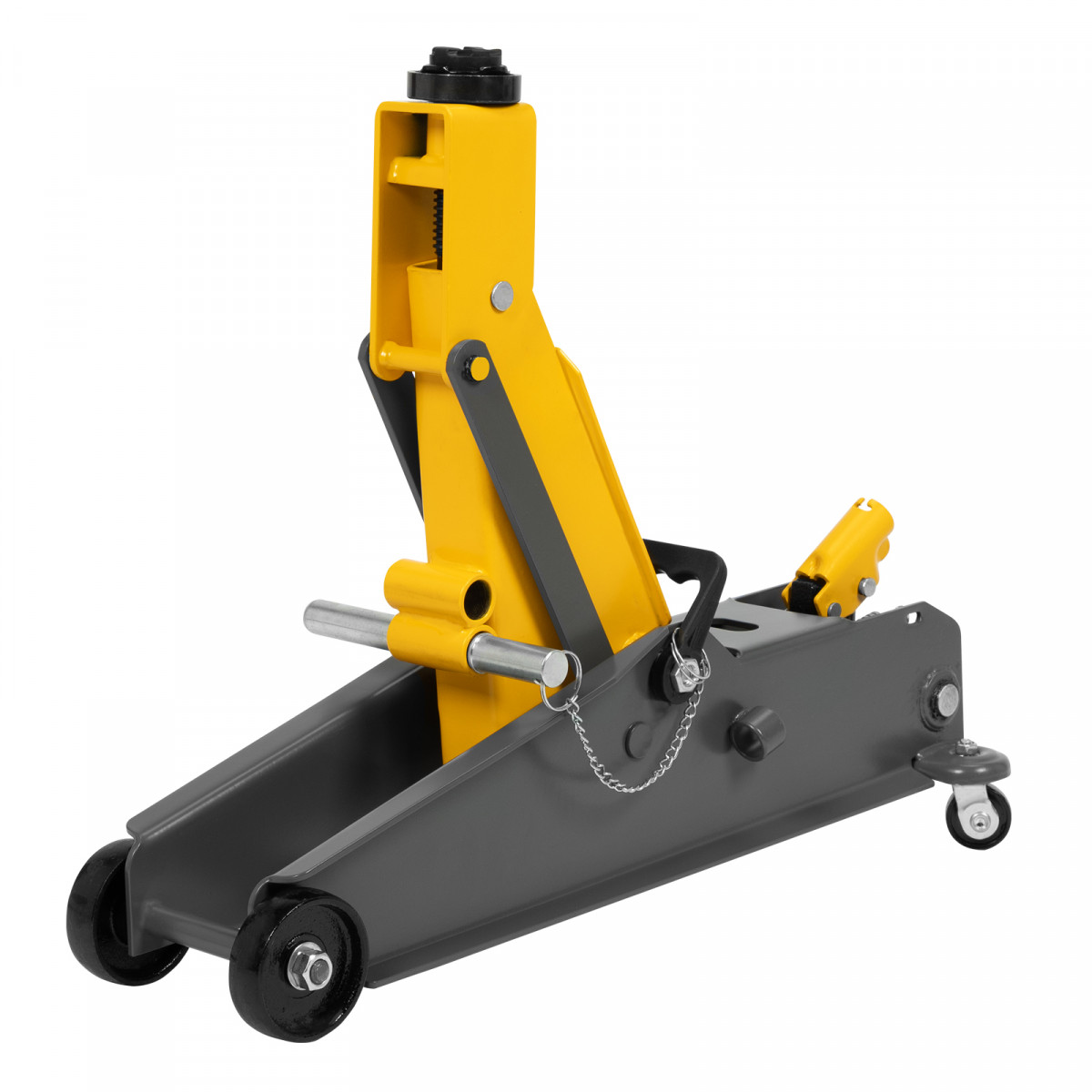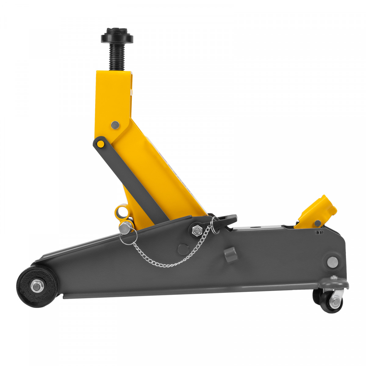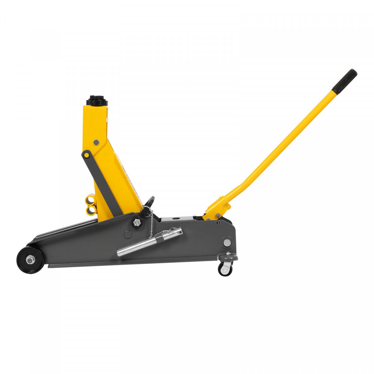 Гидравлический подкатной домкрат Denzel 51261 с фиксатором имеет высоту подхвата 190 мм и предназначен для плавного подъема грузов массой до 3 т (в том числе автомобилей класса SUV) на высоту до 532 мм. Страховочный штифт позволяет фиксировать подъемный рычаг на высоте 410 и 450 мм для безопасной работы. Домкрат пригодится владельцам легковых автомобилей со стандартным клиренсом.