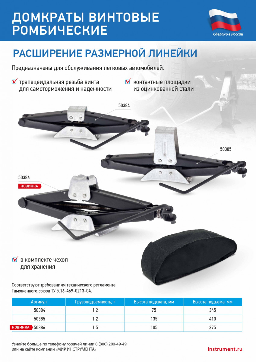Универсальный винтовой ромбический домкрат 50385 соответствует ТУ 5.16-469-0213-04 и предназначен для обслуживания легковых автомобилей массой не более 1,2 т и подъема их на высоту 135-410 мм. Благодаря высоте подхвата 135 мм домкрат подходит для машин со стандартным клиренсом. Он приводится в действие посредством простого и надежного винтового механизма. Будет полезен в гараже, пригодится также и в дороге.