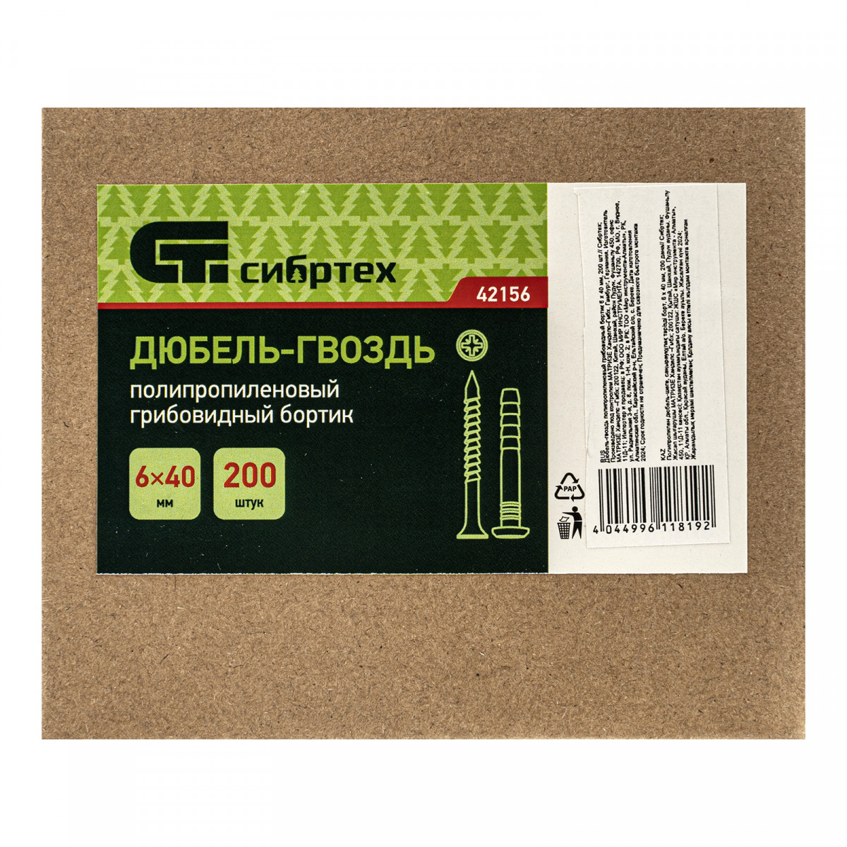 Полипропиленовый дюбель-гвоздь Сибртех 42156 с грибовидным бортиком, размером 6 х 40 мм, 200 шт. в упаковке, используется при проведении ремонтных и отделочных работ. Позволяет крепить плинтусы, рейки, рамки, зажимы, монтажные короба, держатели для труб. Грибовидный бортик плотно прижимает деталь к основанию. Гвоздевой дюбель применяется в профессиональной сфере, подходит также для самостоятельного обустройства квартиры или дачи.