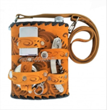 Фляжка (600мл) из нержавеющей стали, обшитая натуральной кожей, с художественным оформлением, со съемным ремешком. В комплект входит: зажигалка, открывалка многофункциональная,стакан складной.