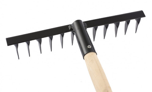- Рабочая часть и тулейка изготовлены из конструкционной углеродистой стали, а зубья утолщены, поэтому грабли выдерживают большие нагрузки.