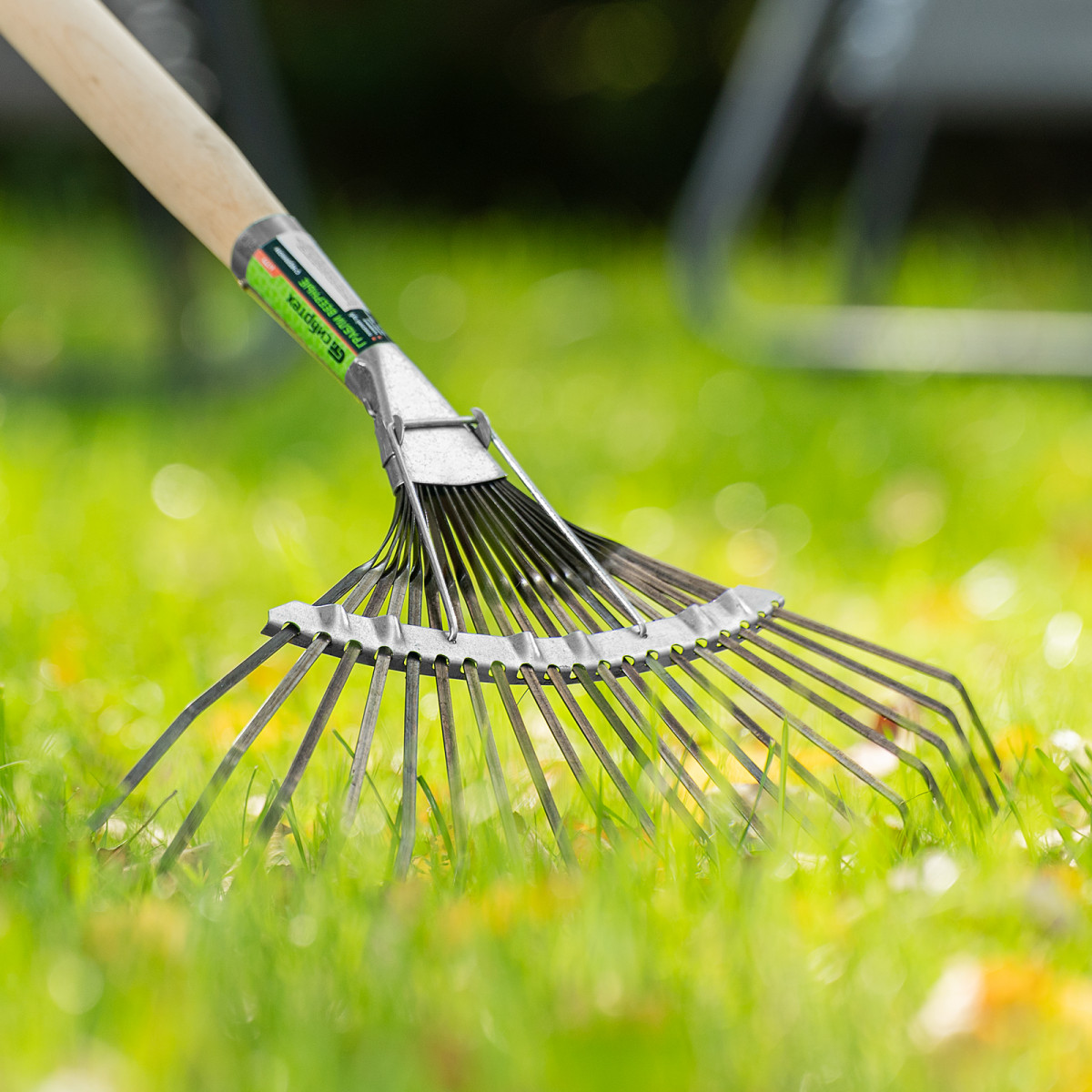 Веерные стальные грабли Сибртех 61779 размером 385 х 1500 мм, с 20 плоскими зубьями и деревянным черенком, предназначены для работы на садовом участке. Позволяют убирать мусор, листву и ветки с лужаек и грядок. Грабли поставляются в сборе с черенком и полностью готовы к эксплуатации.