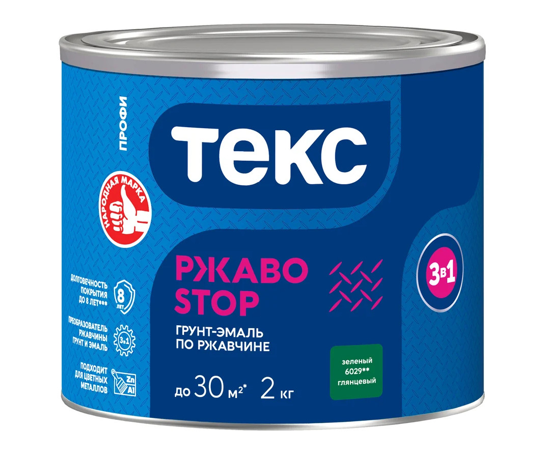 Грунт-эмаль 3в1 РЖАВОSTOP ПРОФИ зеленая глянцевая 2кг ТЕКС