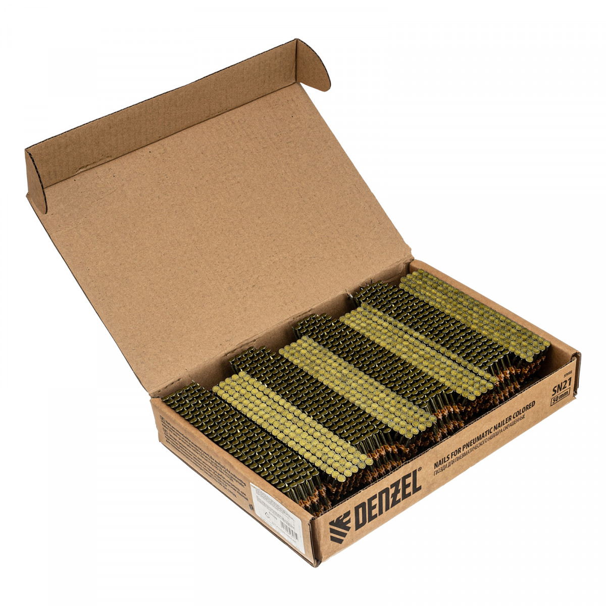 Гвозди Denzel 57692 типа SN21, длиной 50 мм и диаметром 2,9 мм, с крашеной поверхностью, 2000 шт. в упаковке, — расходники для пневматического нейлера. Используются для скрепления различных материалов, будут полезны во время сборочных и отделочных работ.