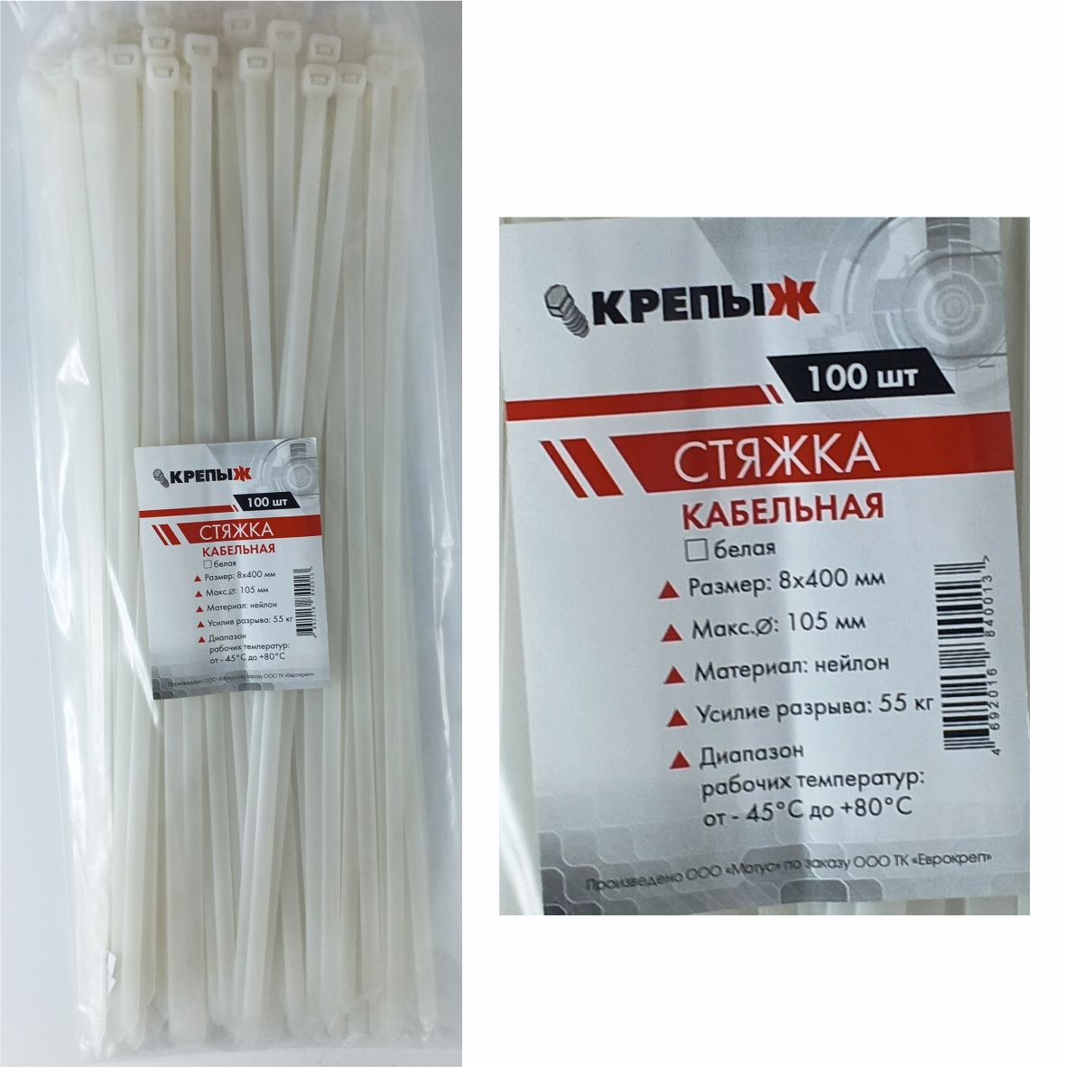 Хомут нейлоновый 8*400 мм белый КРЕПЫЖ