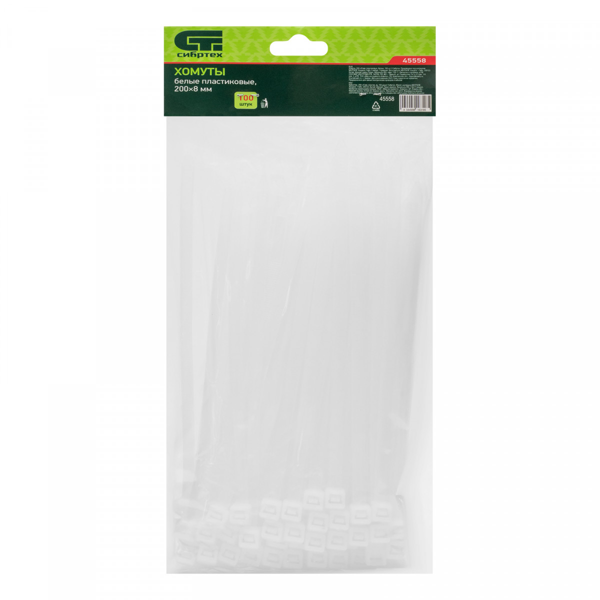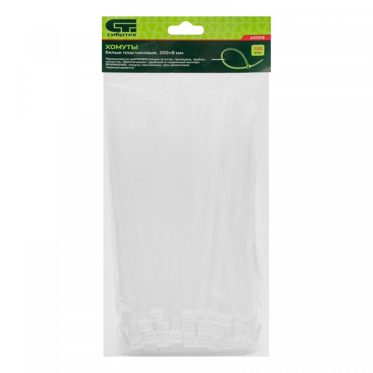 Белые пластиковые хомуты Сибртех 45558, 200 х 8 мм, 100 шт. в упаковке, используются для стяжки кабелей, закрепления трубок, шлангов, рекламных конструкций, а также для упаковки различных предметов. Пригодятся во время прокладки электрических и локальных вычислительных сетей, ремонта компьютерной техники, оформлении торговых стендов, комплектовании товара, будут также полезны дома, на даче и в гараже.