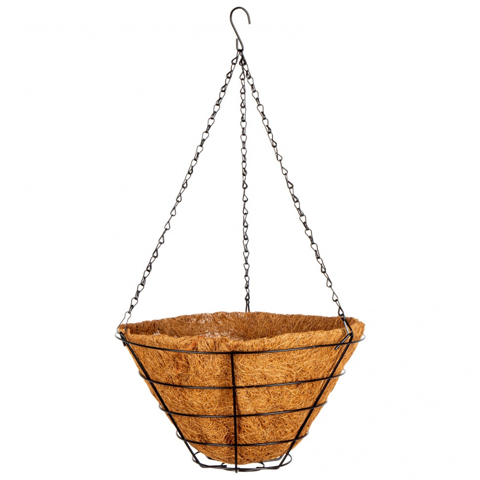 Подвесное кашпо Palisad 69022 диаметром 35 см, с вкладышем из коковиты в форме конуса, используется для посадки ампельных и вьющихся растений. Экологически чистая коковита отлично удерживает влагу и обеспечивает аэрацию корневой системы, что способствует правильному росту растений. Кашпо подходит для подвешивания как внутри, так и снаружи помещения, станет прекрасным украшением дома или сада.Преимущества: - Прочность и долговечность — стальной каркас и цепочки покрыты краской для защиты от коррозии. - Функциональность — горшок не нужно покупать отдельно, растения можно размещать в самом вкладыше. - Продуманная конструкция — кашпо оснащено надежным крючком для подвешивания.