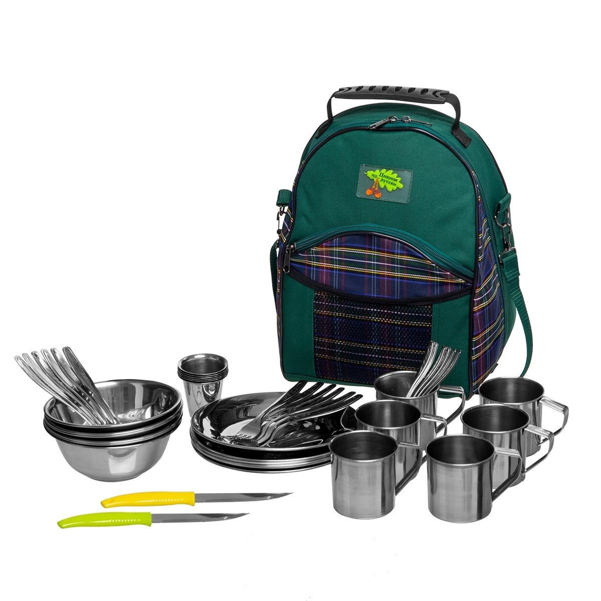 Отправляясь куда-то вшестером, бывалые туристы, охотники, рыбаки и просто любители пикников предпочитают взять этот небольшой кейс. Так гораздо удобнее, чем если каждому участнику брать посуду, рассчитывая только на себя одного: как показывает практика, в подобных обстоятельствах кто-нибудь обязательно что-нибудь да забывает. А в представленной небольшой сумке есть все необходимое для приема пищи, притом упаковано очень грамотно: каждому предмету отведено свое место — забыть что-либо просто невозможно, так что никто не останется без жизненно необходимых кружки, миски или ложки! КОМПЛЕКТАЦИЯ • Кружка Ø 7 см/высота 8 см: 6 шт; • Стаканы Ø 7 см/высота 11 см: 6 шт; • Стопка Ø 6 см/высота 6 см: 6 шт; • Тарелка Ø 20 см: 6 шт; • Миска глубокая Ø 16 см/глубина 6 см: 6 шт; • Ложка столовая: 6 шт; • Вилка: 6 шт; • Ложка чайная: 6 шт; • Нож: 2 шт.