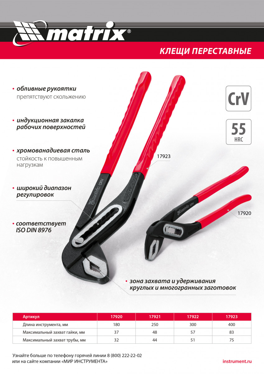 Переставные клещи Matrix 17923 длиной 400 мм, выполненные из хромованадиевой стали, с обливными рукоятками, используются для проведения монтажных и слесарных работ. Универсальный инструмент заменяет ключи различных размеров и применяется для фиксации заготовок, откручивания гаек, зажима и удержания труб диаметром до 75 мм.