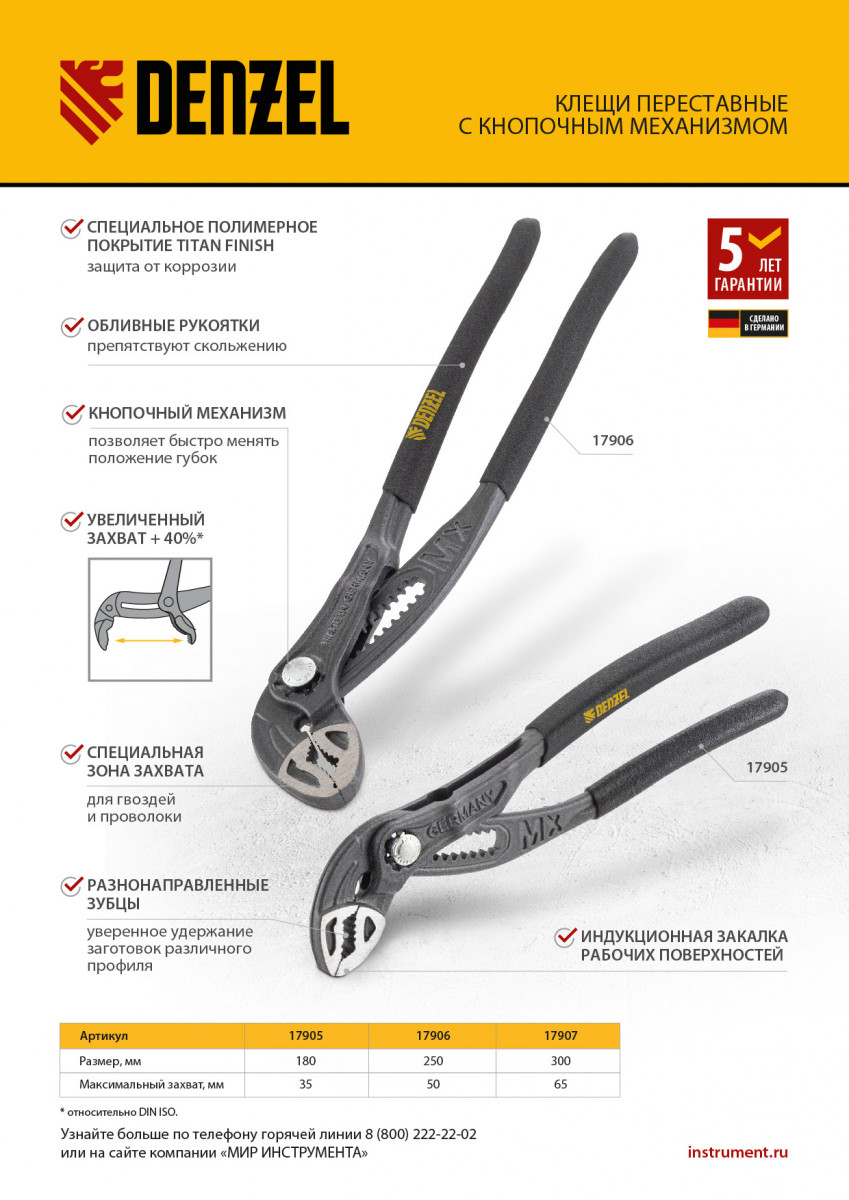 Переставные клещи Denzel 17907 длиной 300 мм, с обливными рукоятками и кнопочным механизмом, предназначены для фиксации и вращения деталей и заготовок различной формы. Подходят для захвата фитингов, труб, крепежных элементов. Инструмент удобен для работы в труднодоступных местах, используется при проведении ремонтных, монтажных, сантехнических работ.