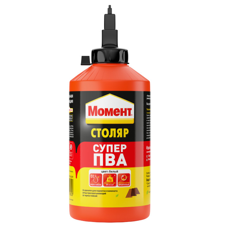 Момент Супер ПВА быстросхватывающий термостойкий высокопрочный клей для всех пород дерева, ДСП, ДВМ, МТФ, фанеры, шпона, ламината, картона, фурнитуры, ткани, кожи, некоторых пластиков. Момент Супер ПВА рекомендуется для монтажного склеивания ламинированных и паркетных напольных покрытий. Водостойкость D2 (устойчив к кратковременному воздействию воды).