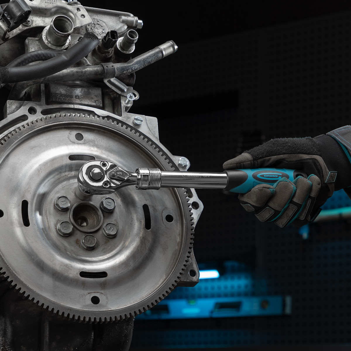 Телескопический хромированный трещоточный ключ Gross 14070, 305-445 мм, из стали CrV, с присоединительным квадратом 1/2 дюйма и 2-компонентной рукояткой, предназначен для монтажных работ с резьбовыми соединениями. Особенно удобен для работы в труднодоступных местах, т.к. имеет запатентованный механизм фиксации телескопической рукоятки. Ее длину можно изменить с 305 до 445 мм. Инструмент используется в слесарных мастерских, автосервисах, пригодится и в быту.