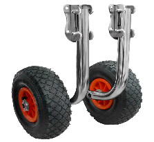 Транцевые колеса, установленные на моторно-гребную лодку ПВХ с жестким транцем, существенно, упрощают транспортировку судна от воды до места стоянки. Закрепляются на транцевой плите при помощи винтов и гаек. Имеют фиксаторы в рабочем и сложенном положении. Надувные колеса позволяют приспособиться к различному типу грунта, изменяя давление в шине.