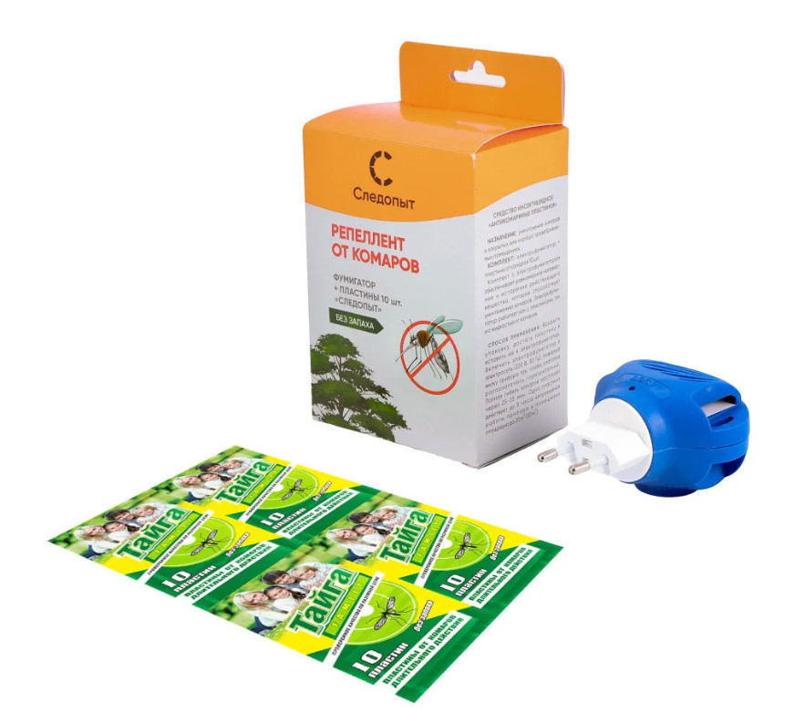 Комплект включает в себя: электрофумигатор и пластины от комаров "Следопыт", 10 шт.
