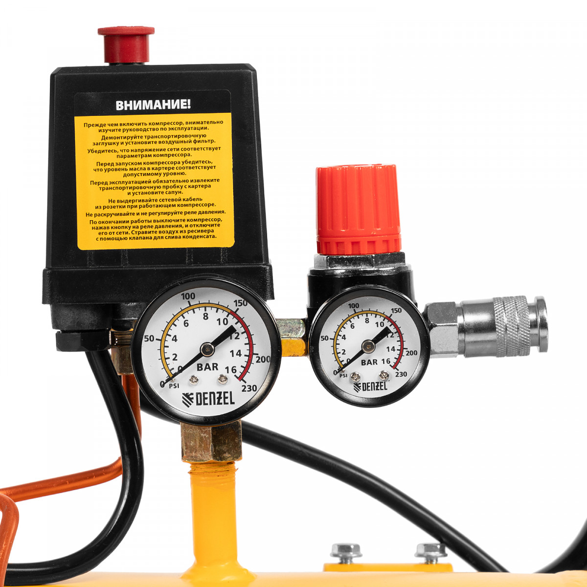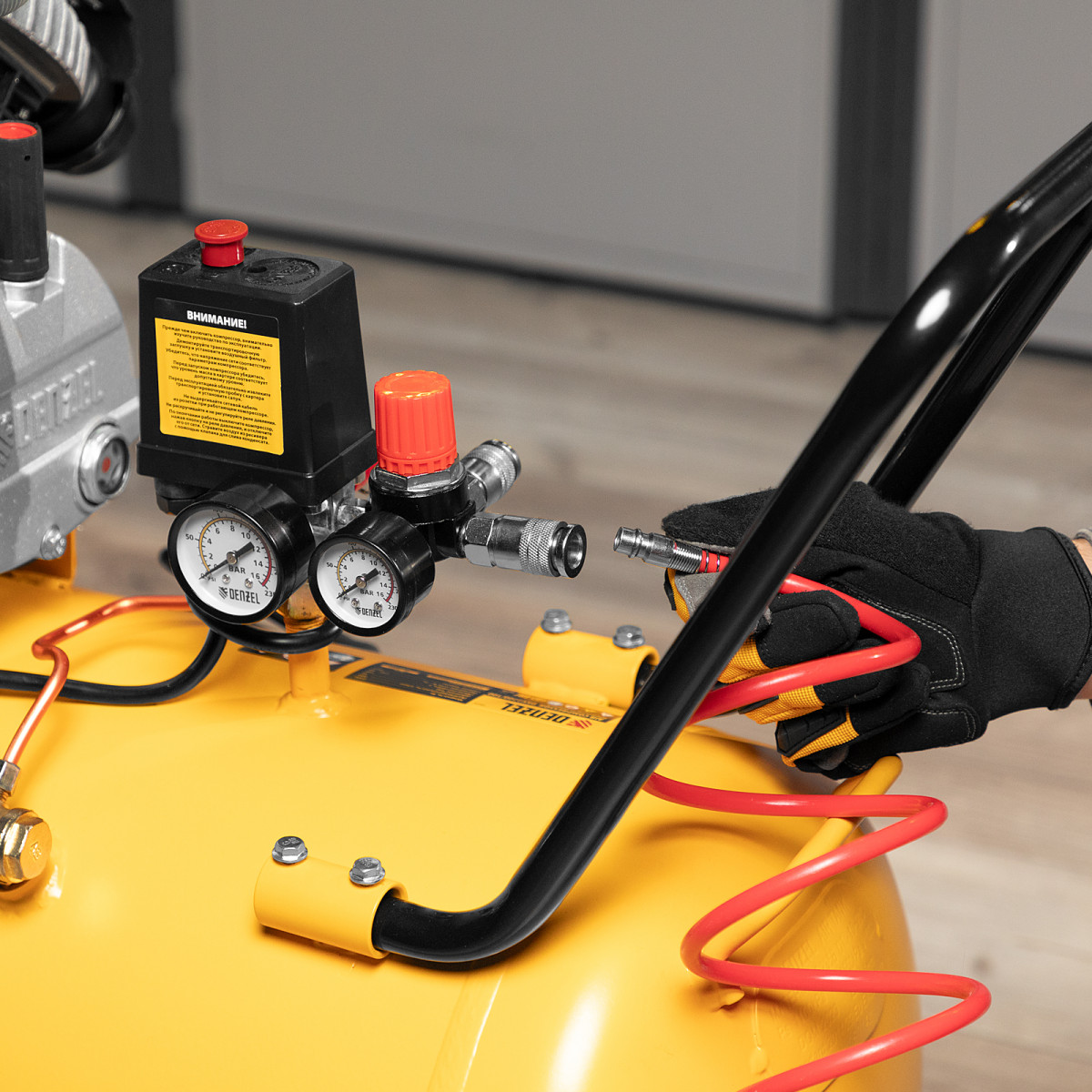- Удобный контроль работы — 2 манометра позволяют следить за давлением в ресивере и на выходе компрессора.